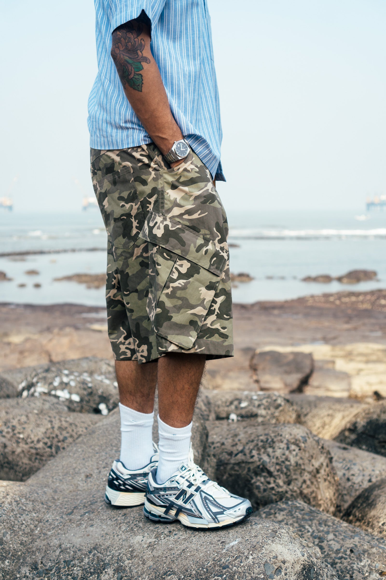 The only pair of baggy camo shorts you'll ever need! Our Balloon Cargo Shorts are a versatile blend of Japanese informed streetwear and military functionality. These shorts feature an elasticated waist, a pleated front, large cargo pockets and a metal D-ring on the belt loop to secure keys or charms.