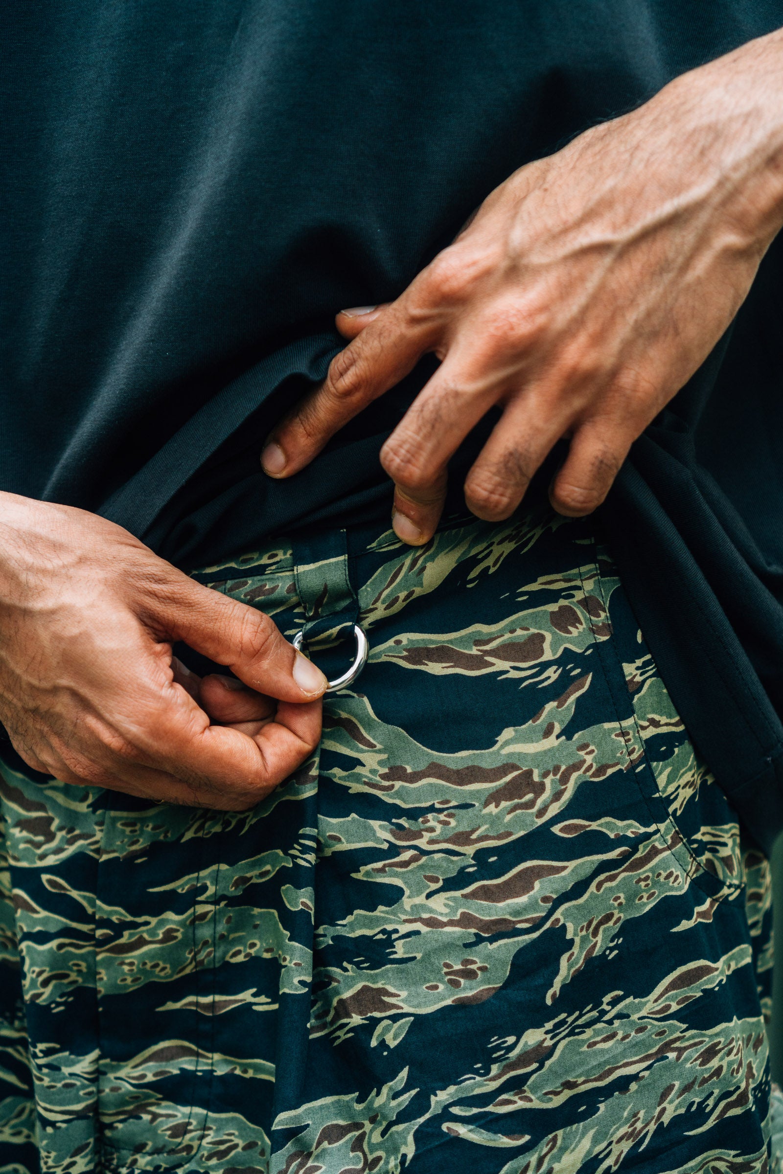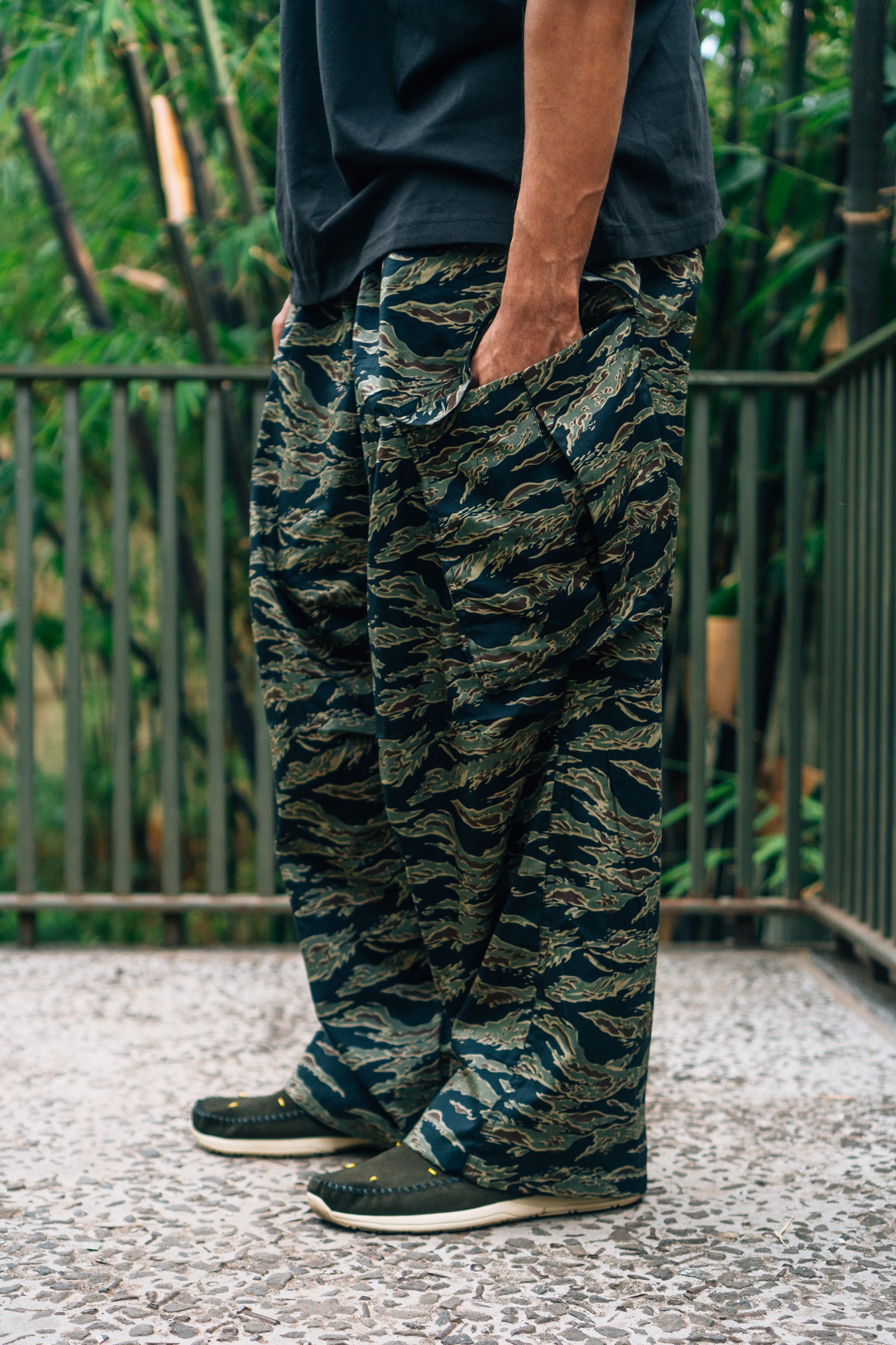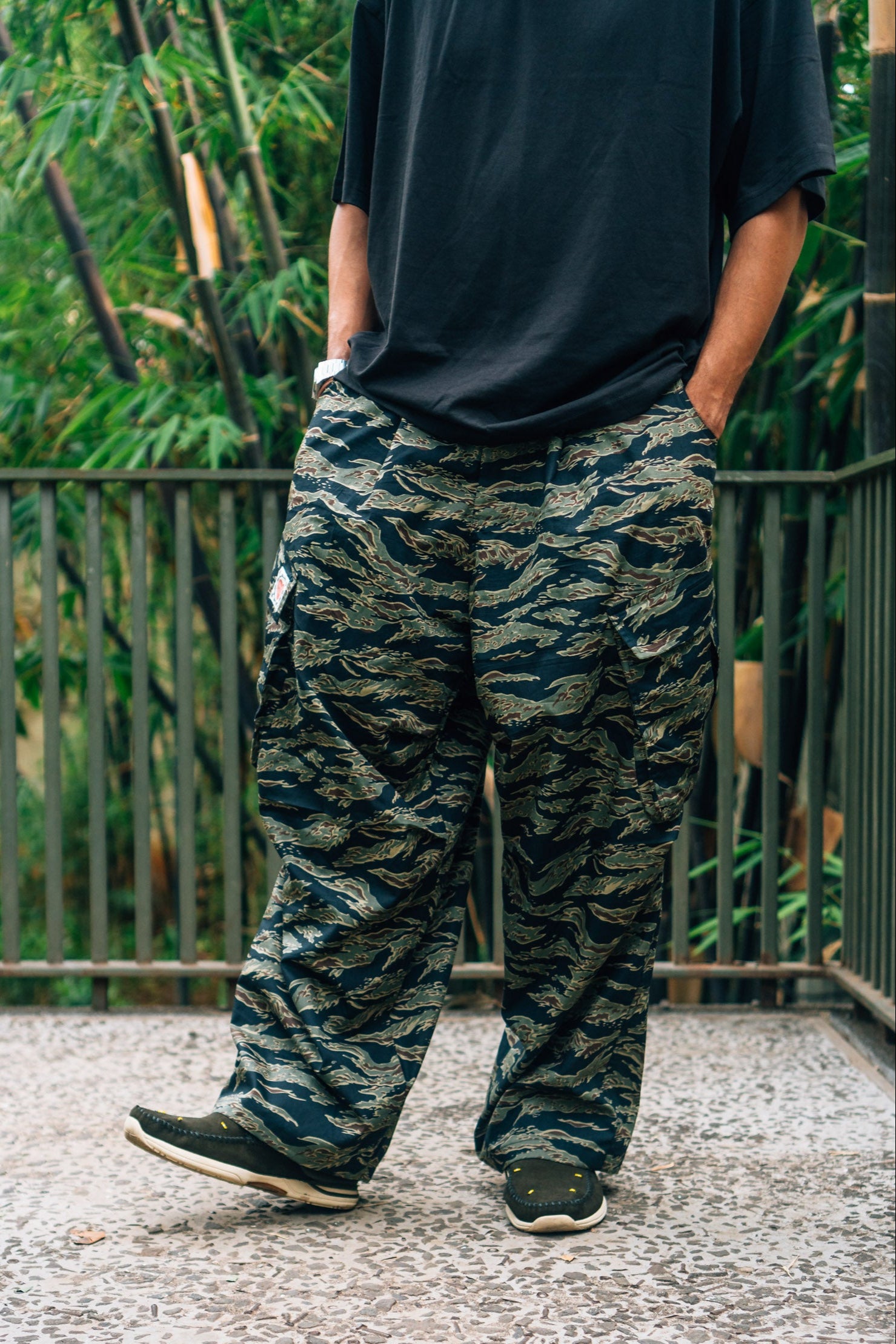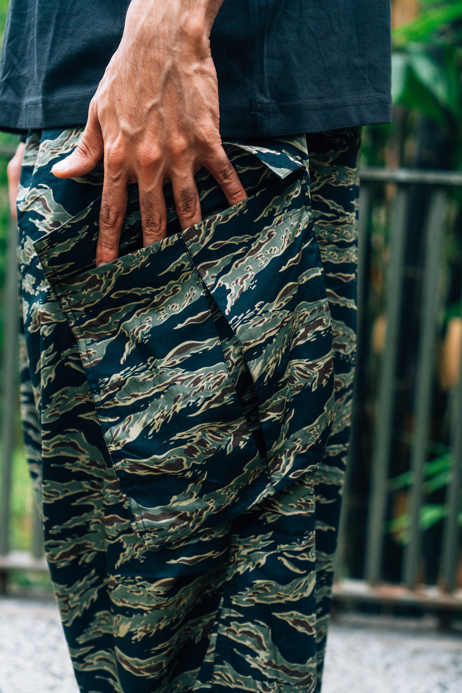 Tiger camouflage is a combination of French lizard camouflage and British Denison camouflage. In the early 1960s, tiger stripe camouflage gained popularity among American military advisers. U.S. Special Forces personnel working alongside the South Vietnamese Army preferred this jungle-adapted pattern over the standard-issue olive drab uniforms. Our cargo Pants pay tribute to vintage military clothing with a nod to timeless utility and style.
