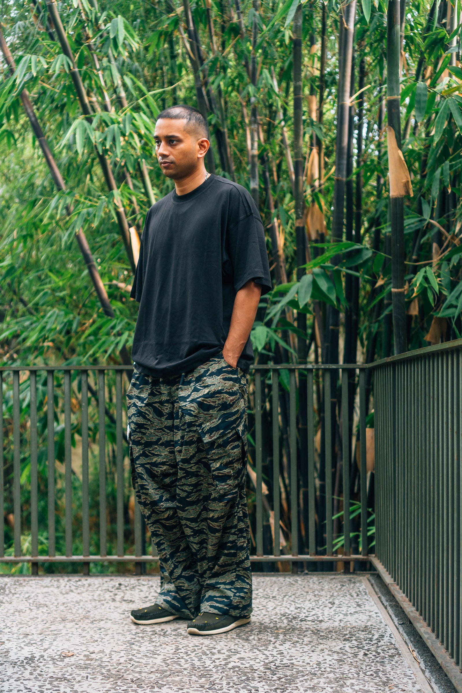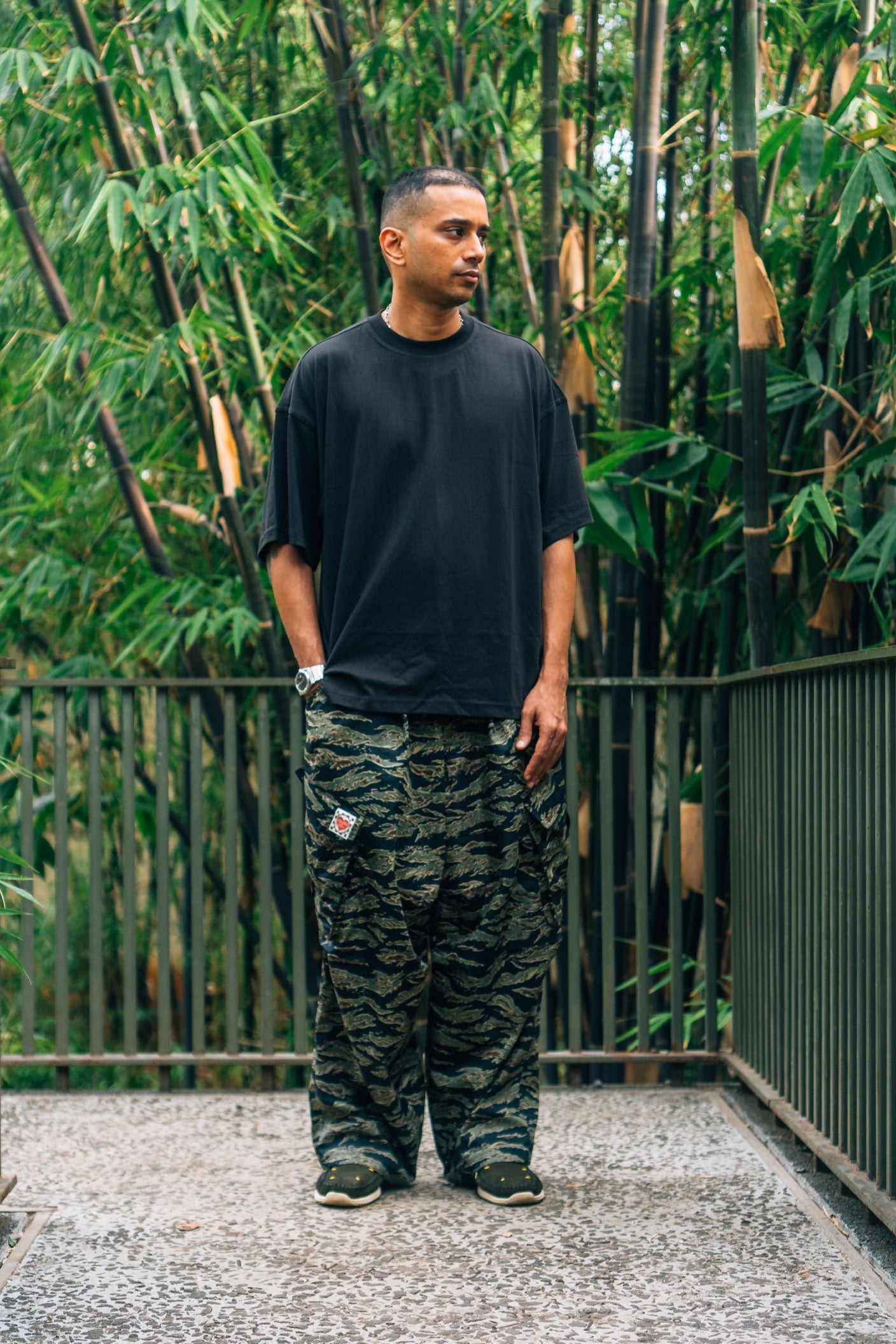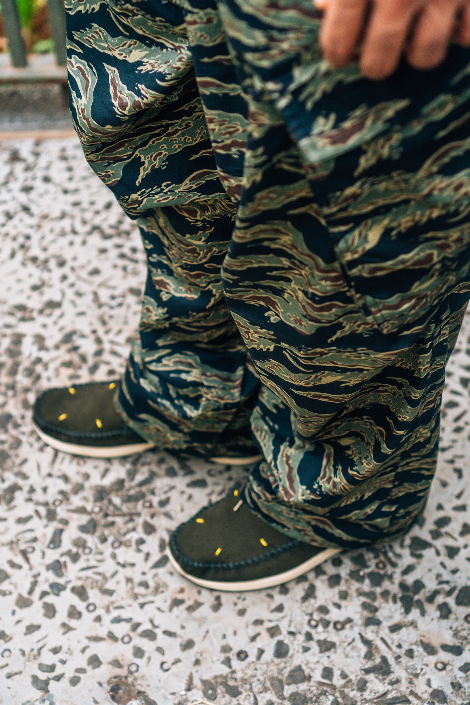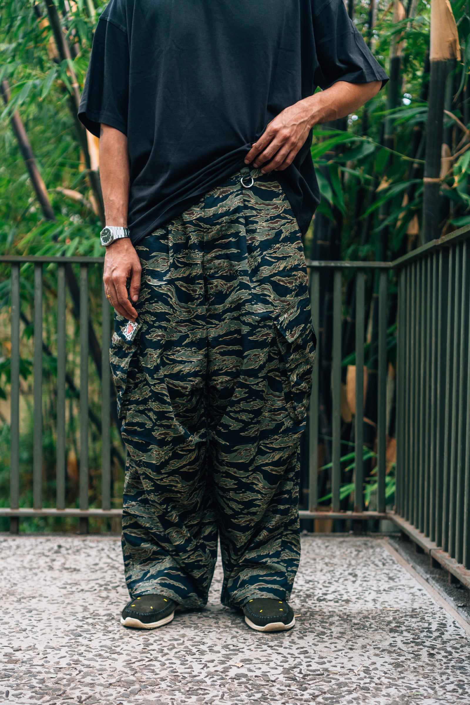 Tiger camouflage is a combination of French lizard camouflage and British Denison camouflage. In the early 1960s, tiger stripe camouflage gained popularity among American military advisers. U.S. Special Forces personnel working alongside the South Vietnamese Army preferred this jungle-adapted pattern over the standard-issue olive drab uniforms. Our cargo Pants pay tribute to vintage military clothing with a nod to timeless utility and style.