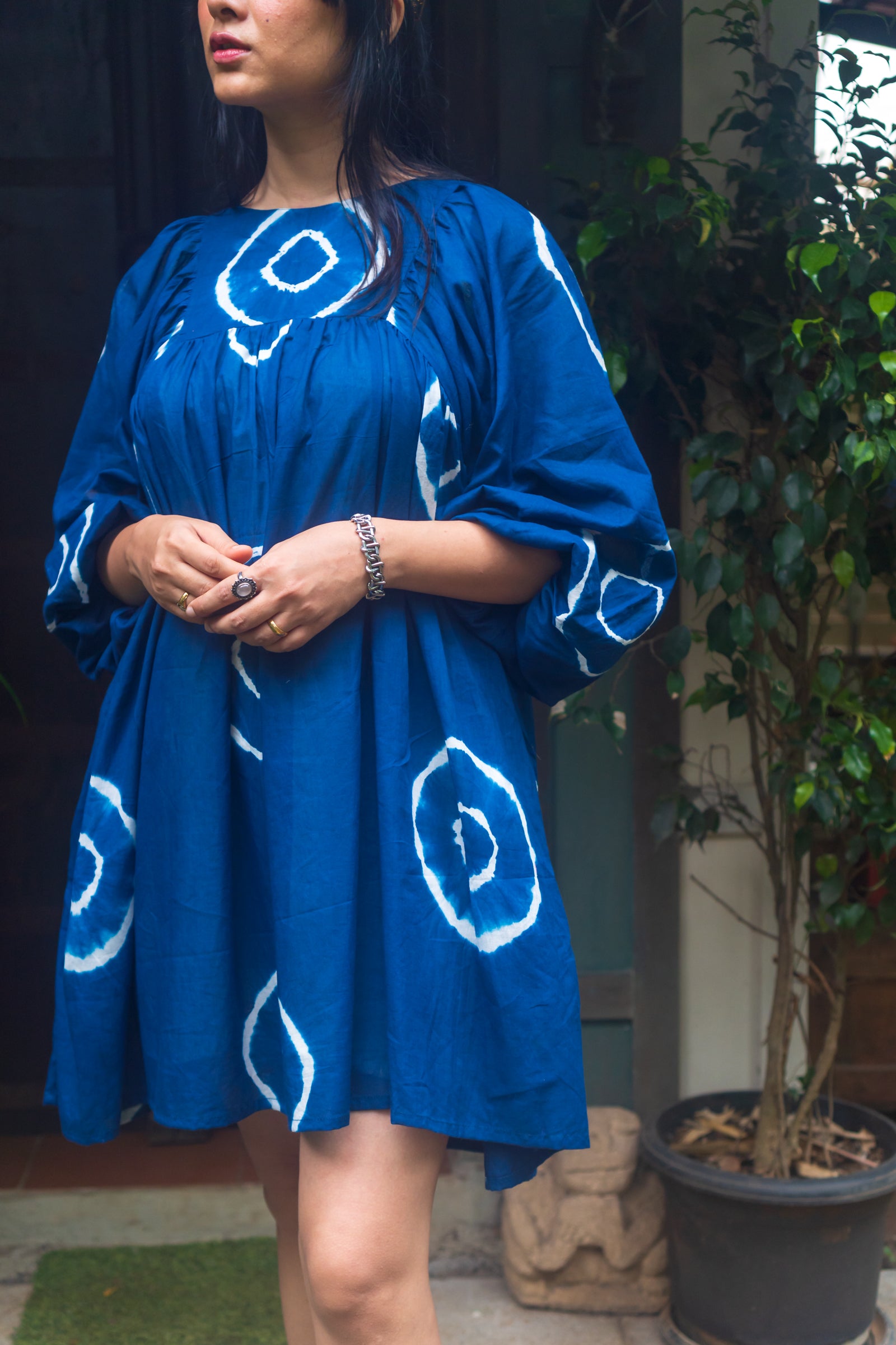 This floaty and flattering short dress is handcrafted in pure cotton and is hand Tie-Dyed using Natural Dye by our artisan partner in Rajasthan. It has two in-seam pockets on either side and balloon sleeves with elastic cuffs. Whether you're hitting the beach this summer or having fun picnics, this vibrant dress is a must have!