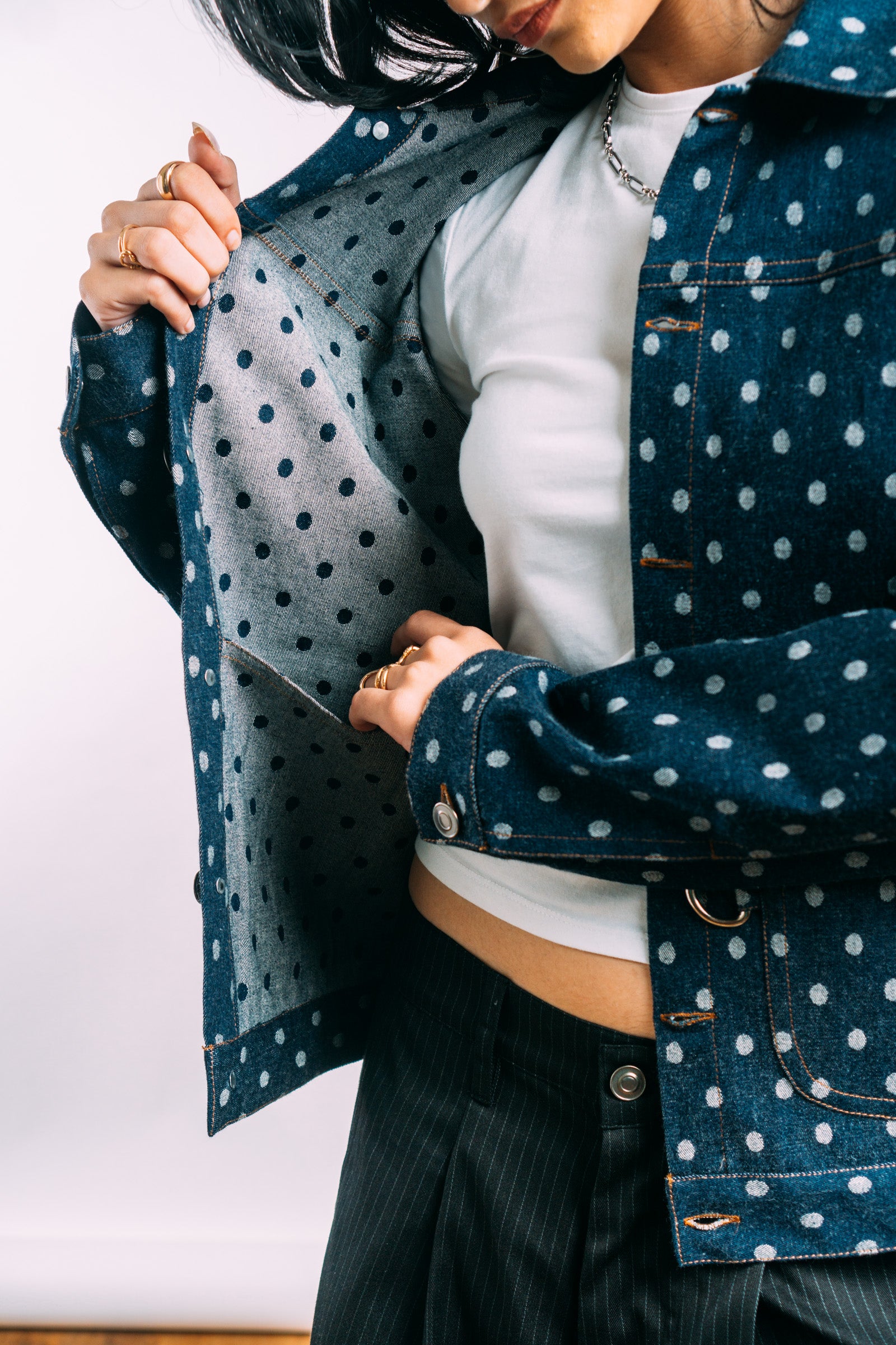 Our signature denim work jacket return this season in Polka Dots. First popularised in 19th-century Europe and Japan, today, polka dots have reemerged as a modern favourite - offering a nostalgic yet refreshing pattern that bridges vintage character with contemporary style.