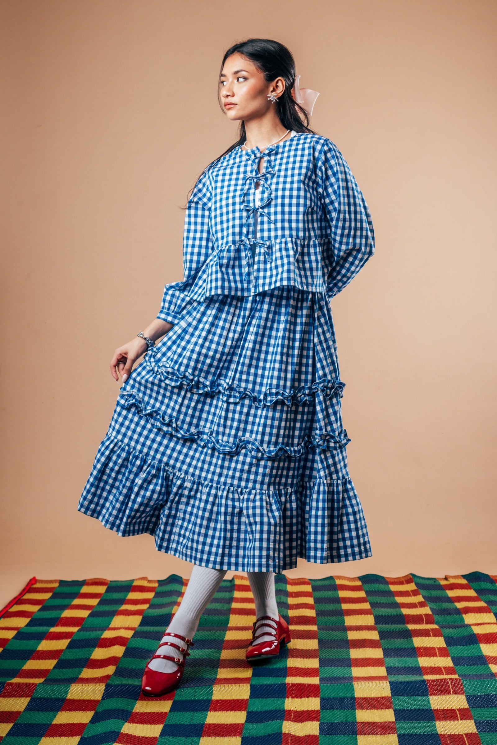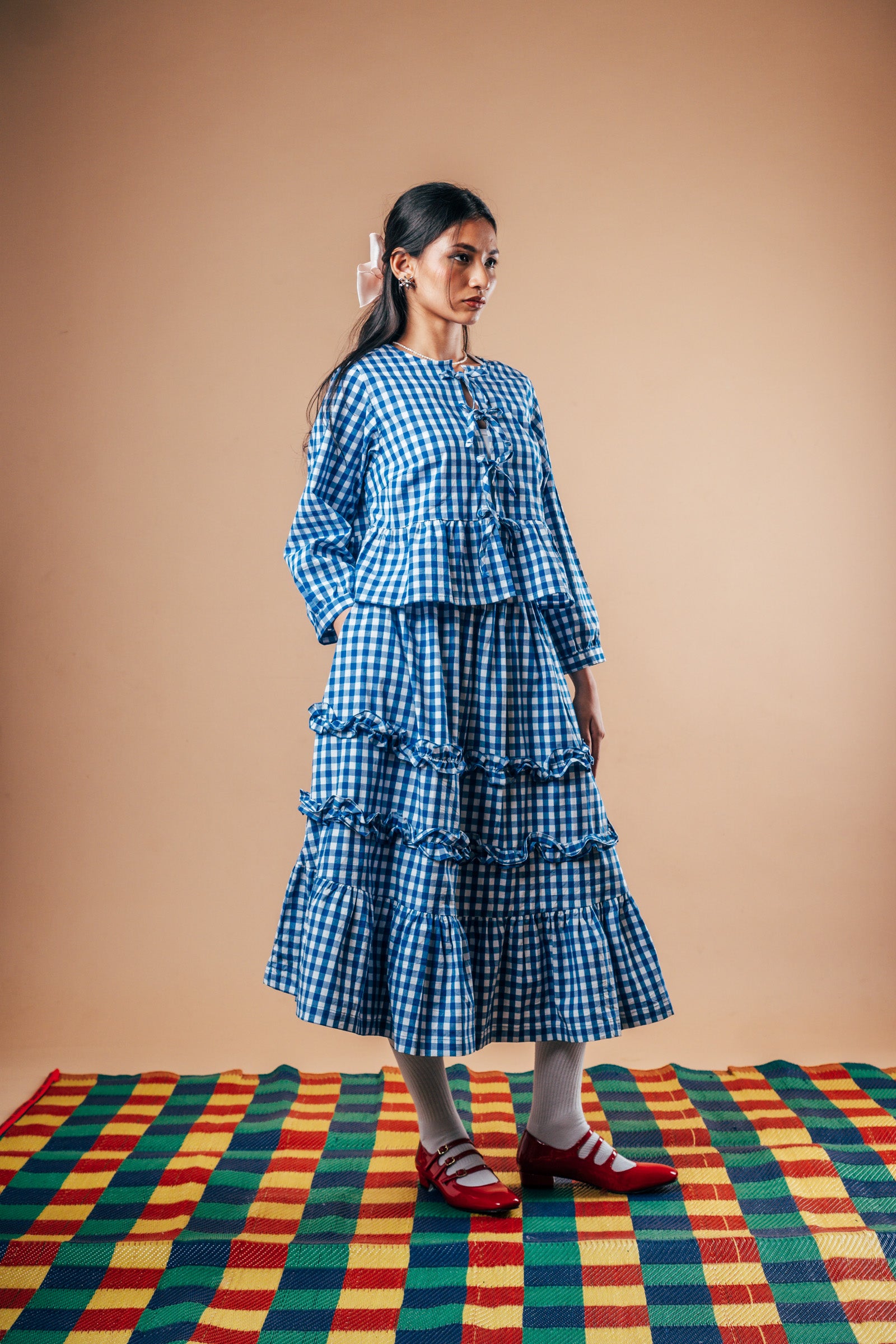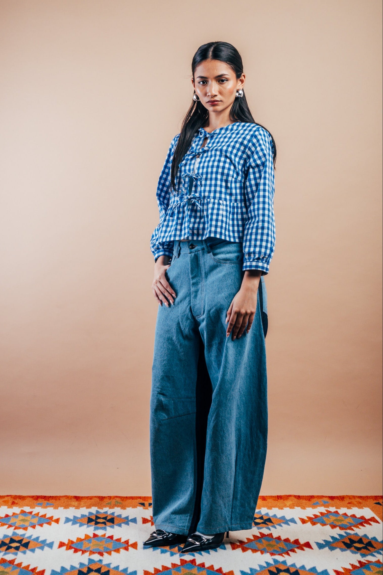 A chic gingham peplum top with front tie up details. Added flair around the waist. Pair it with our matching ruffled skirt or horseshoe denim for a stylish look. You can also layer it over a tank top for a more modest outfit. Made using 100% deadstock, surplus mill fabric.