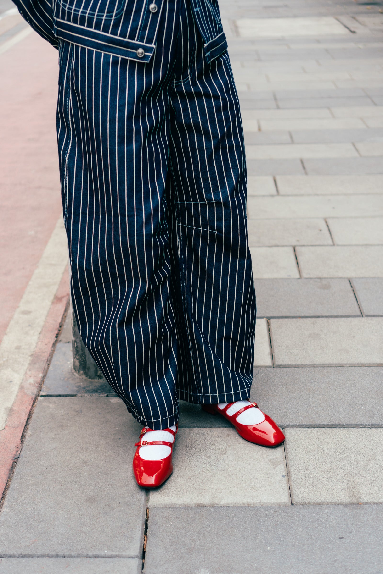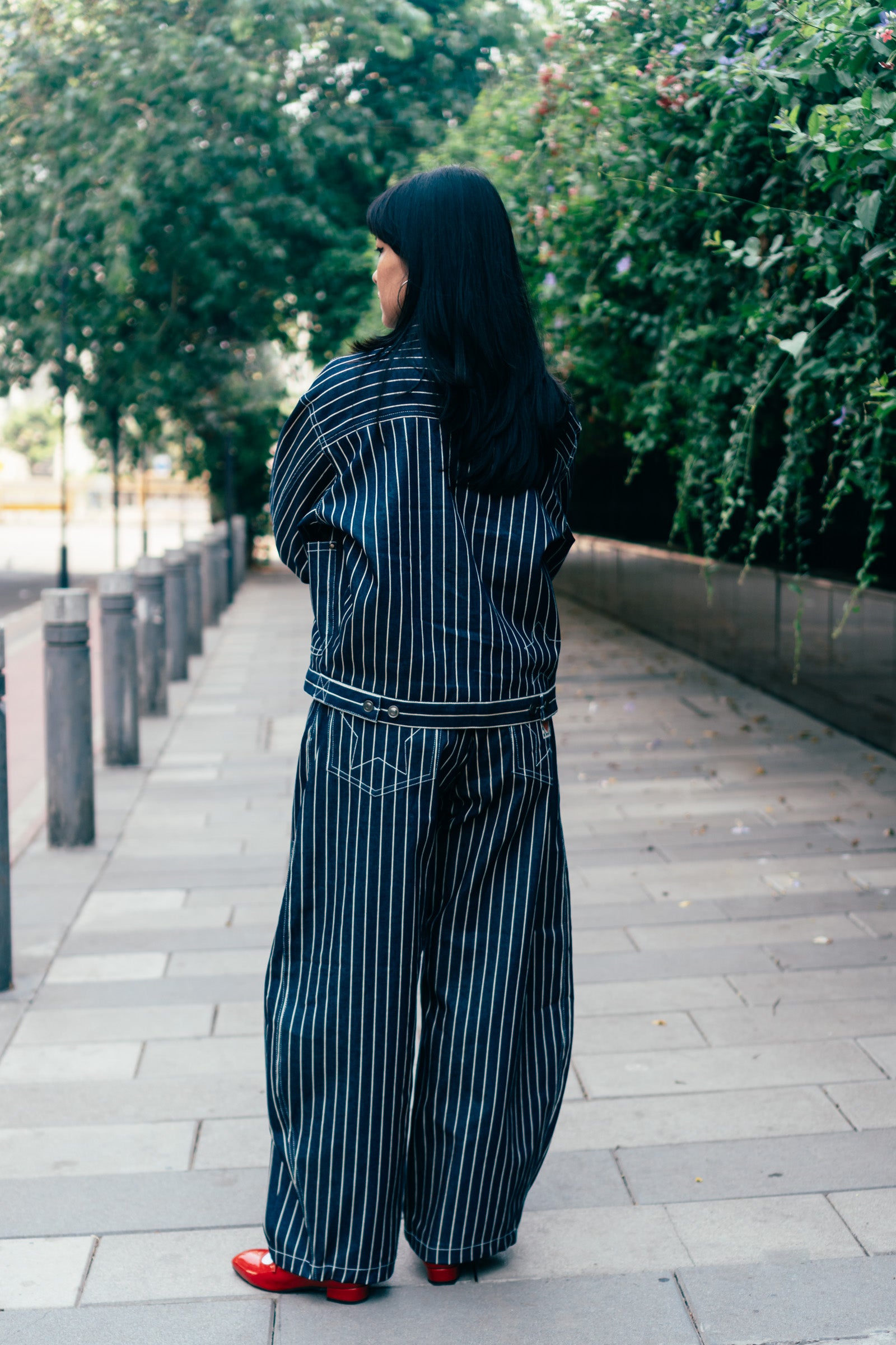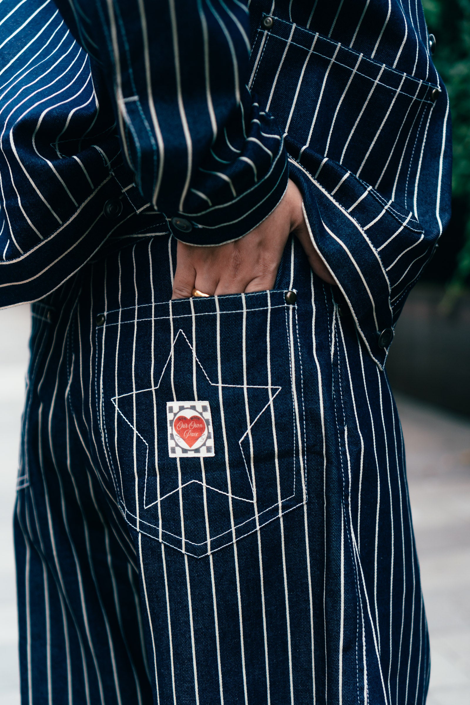 Our striped denim set is a tribute to vintage striped workwear fabrics like Hickory and Wabash in our version of the most popular jeans of the season: the Barrel jeans or aptly named, the Horseshoe jeans. Fashioned with curved, wide legs that taper at the ankle, they also feature hand applied antique brass rivets and a heart logo patch. These are unisex jeans crafted from denim with a slight stretch for extra comfort.