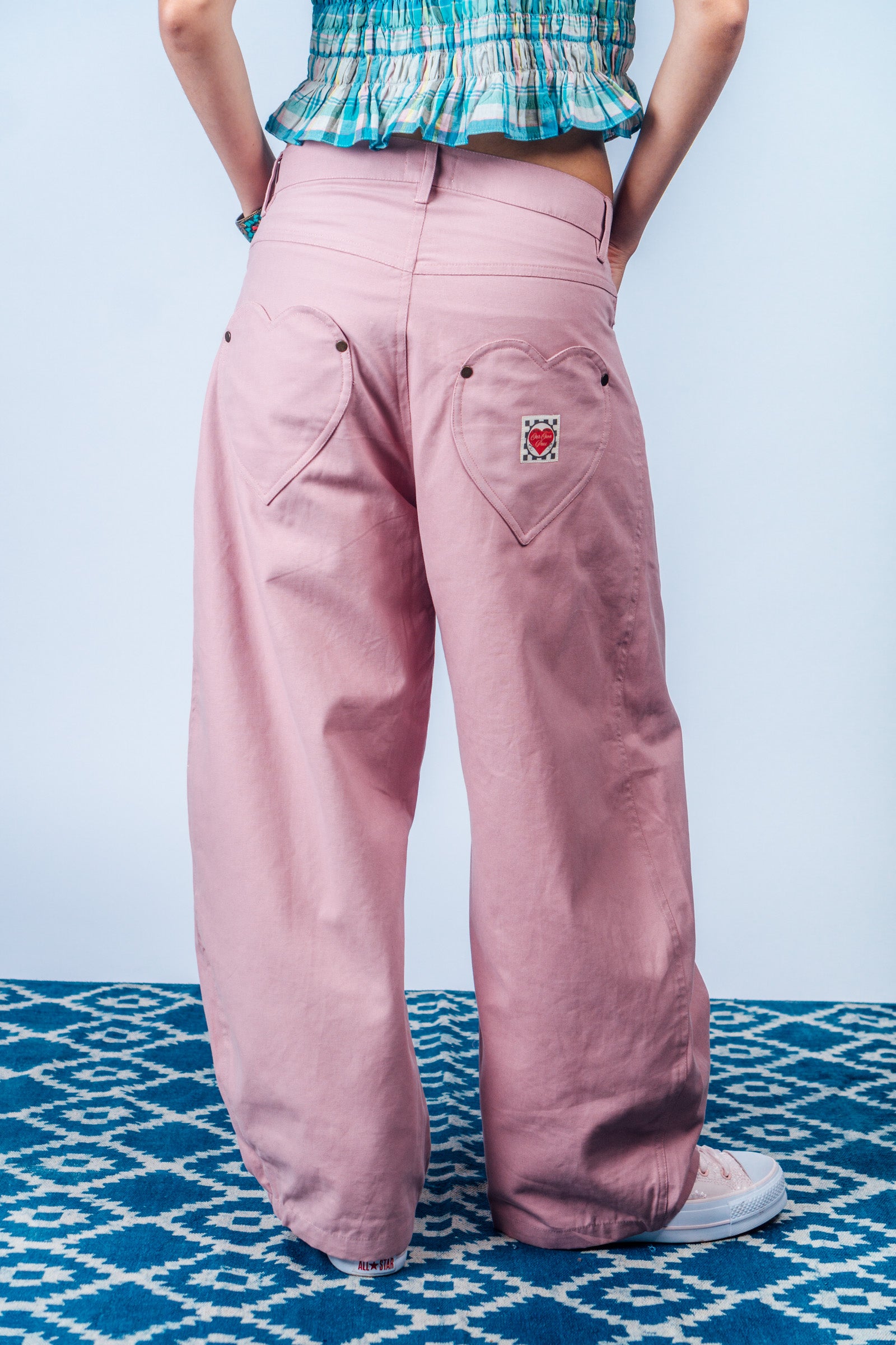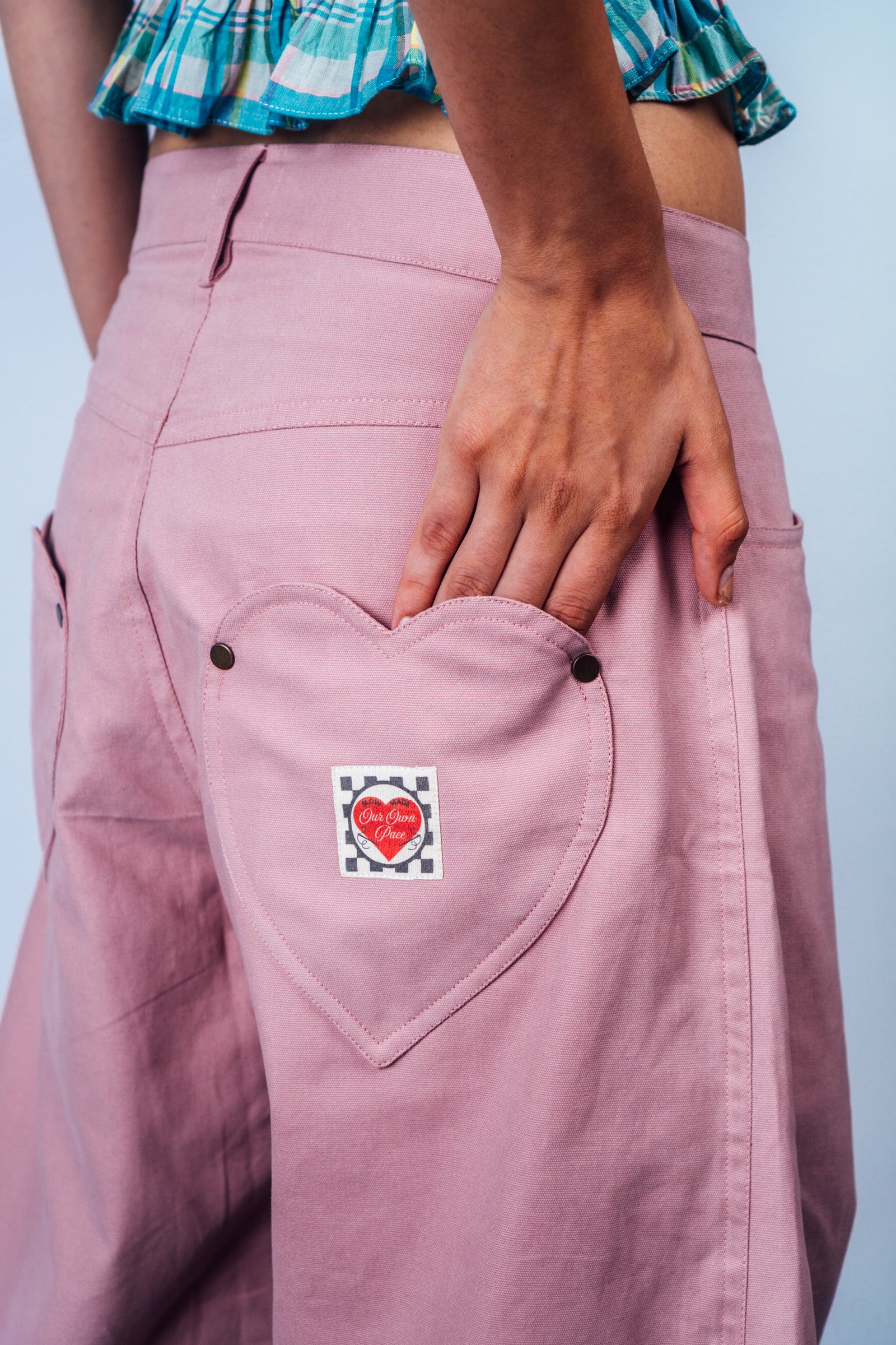 Our Bestselling Horseshoe Pants now in a cute Dust Pink color with Playful Heart-shaped Pockets - YESSS! These jeans are fashioned with a curved, wide legs that taper at the ankle. This playful pair is definitely a fun silhouette to add to your Summer Pants collection - looks great paired with any top or shirt from Our Own Pace.