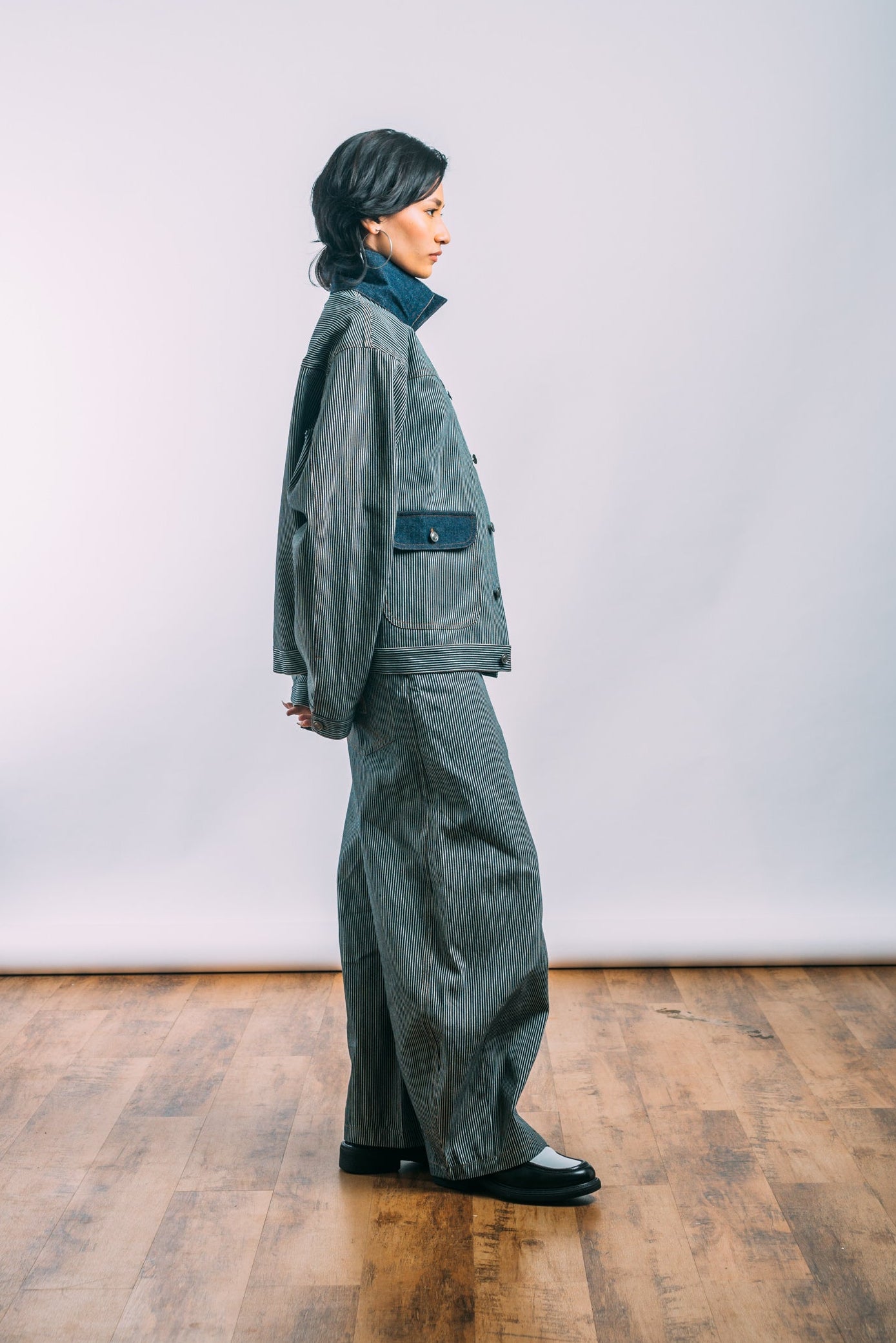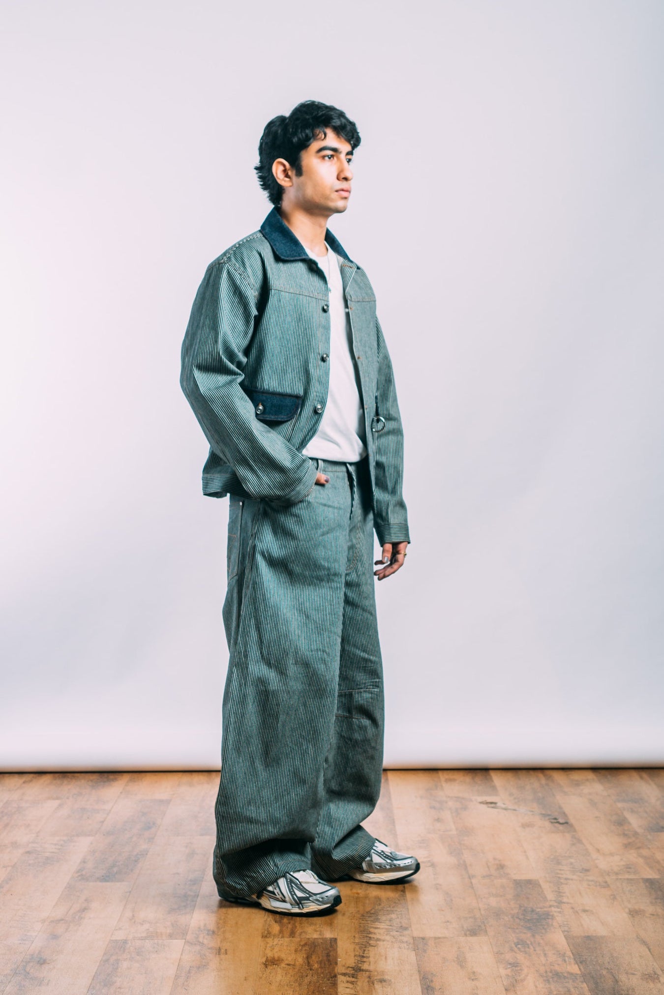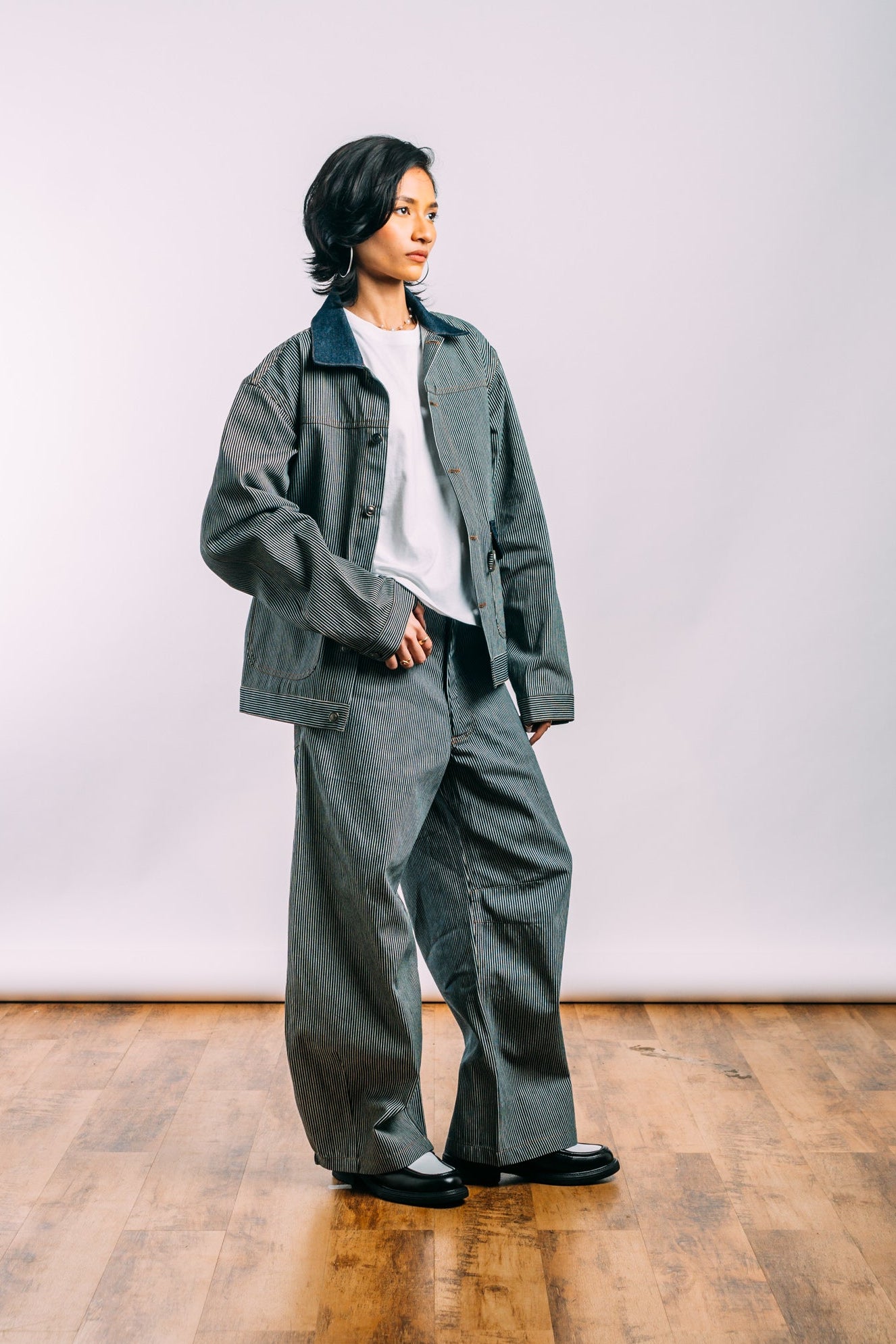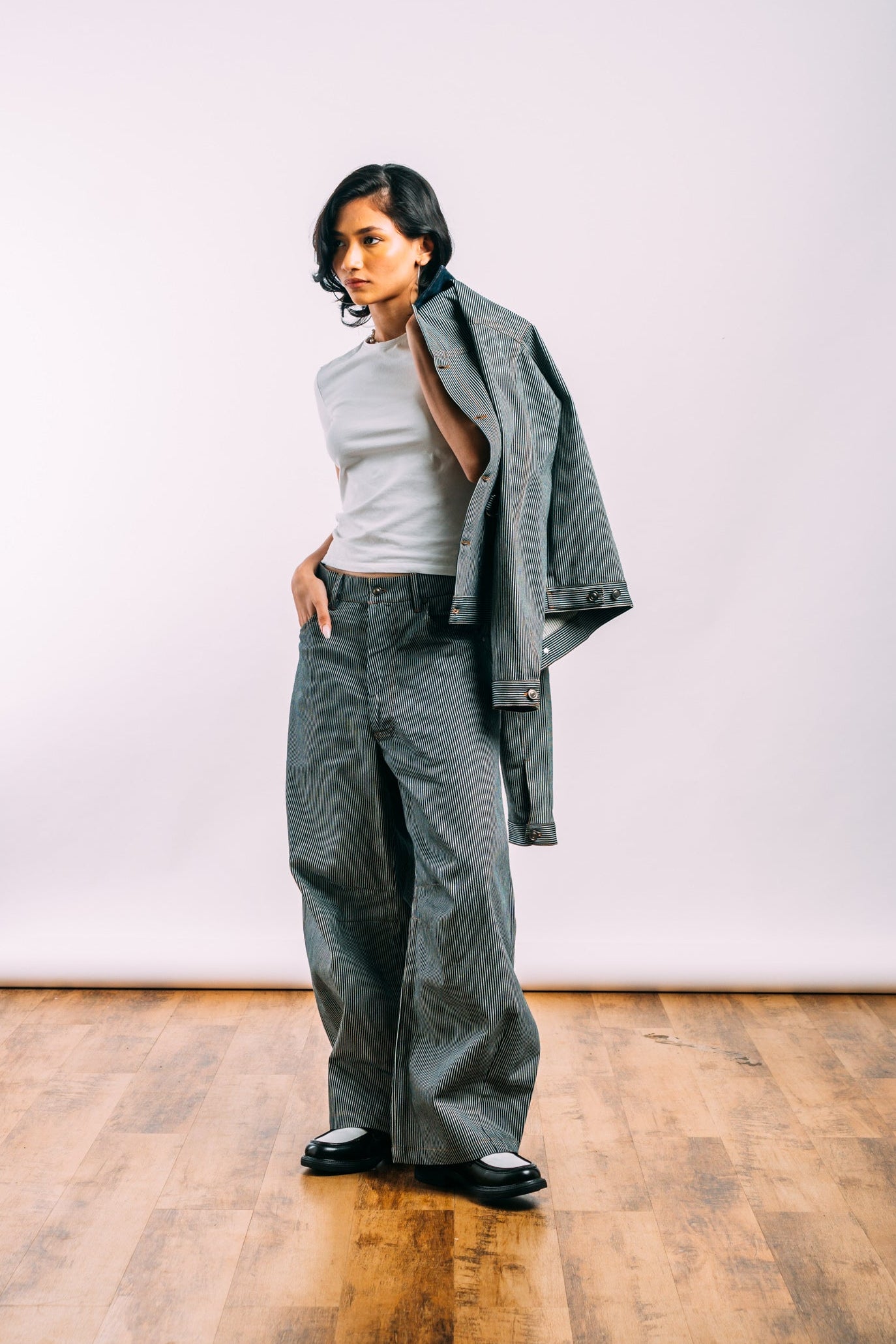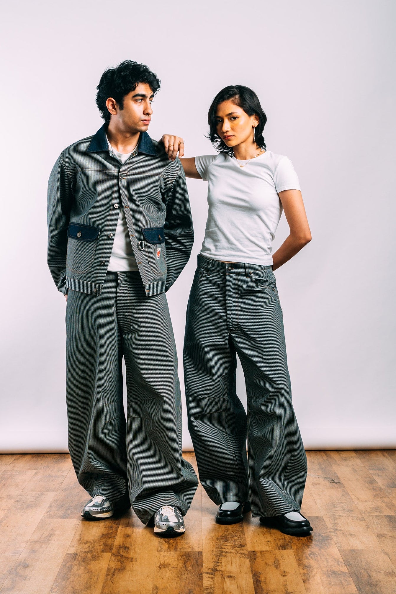Our version of the most popular jeans of the season: the Horseshoe jeans, fashioned with curved, wide legs that taper at the ankle, they also feature hand applied antique brass rivets and a heart logo patch. These are crafted from Hickory Denim - Originating in the 19th century as the fabric of choice for railroad and workshop uniforms, Hickory denim was prized for its strength and practicality. Its striped pattern - once a marker of the American worker - continues to inspire modern interpretations of timeless, utilitarian design.