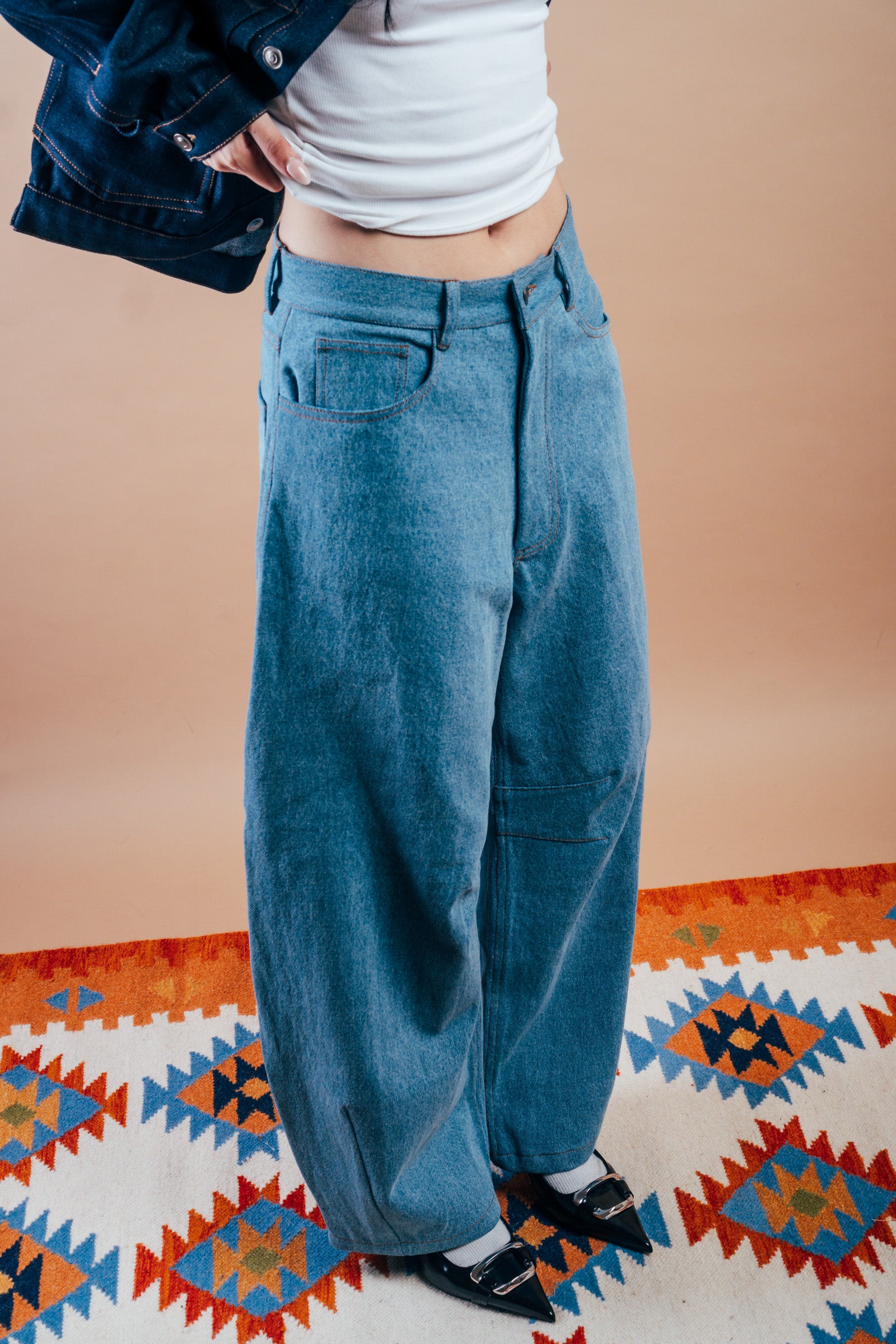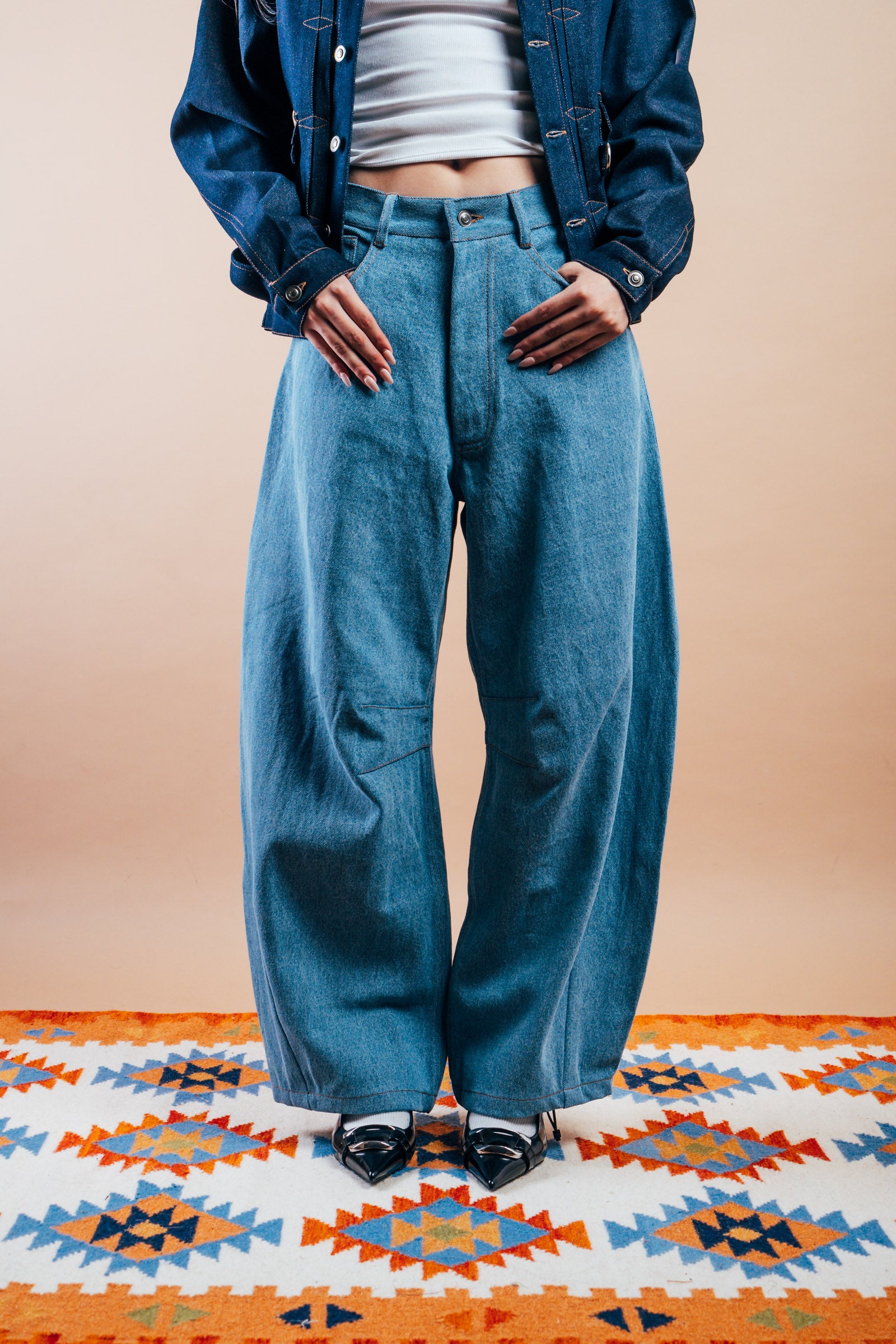 Our version of the most popular jeans of the season: the Barrel jeans or aptly named, the Horseshoe jeans is fashioned with a curved, wide legs that taper at the ankle. This playful pair of jeans is a fun silhouette to add to your denim collection - looks great paired with any top or shirt from the same collection.