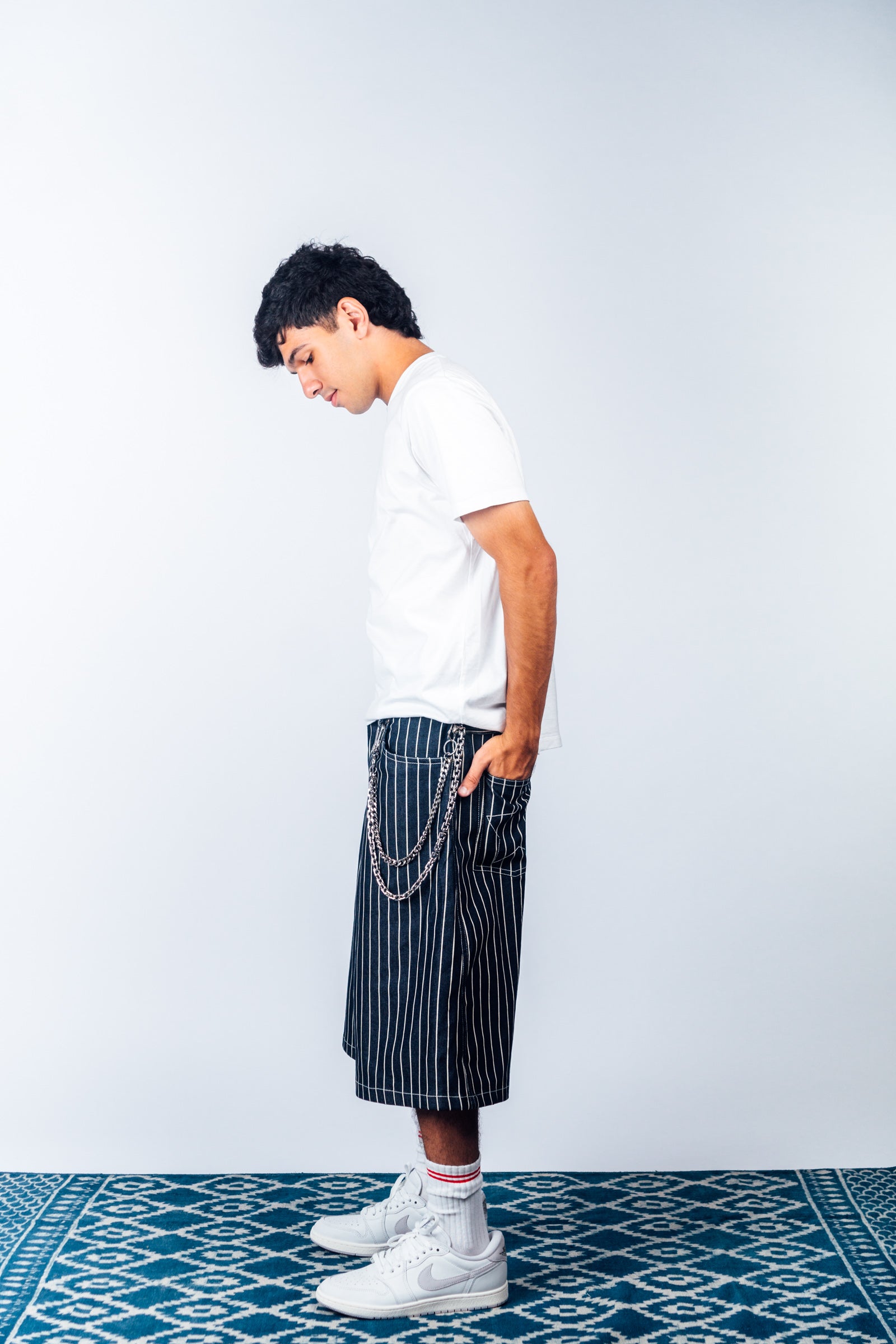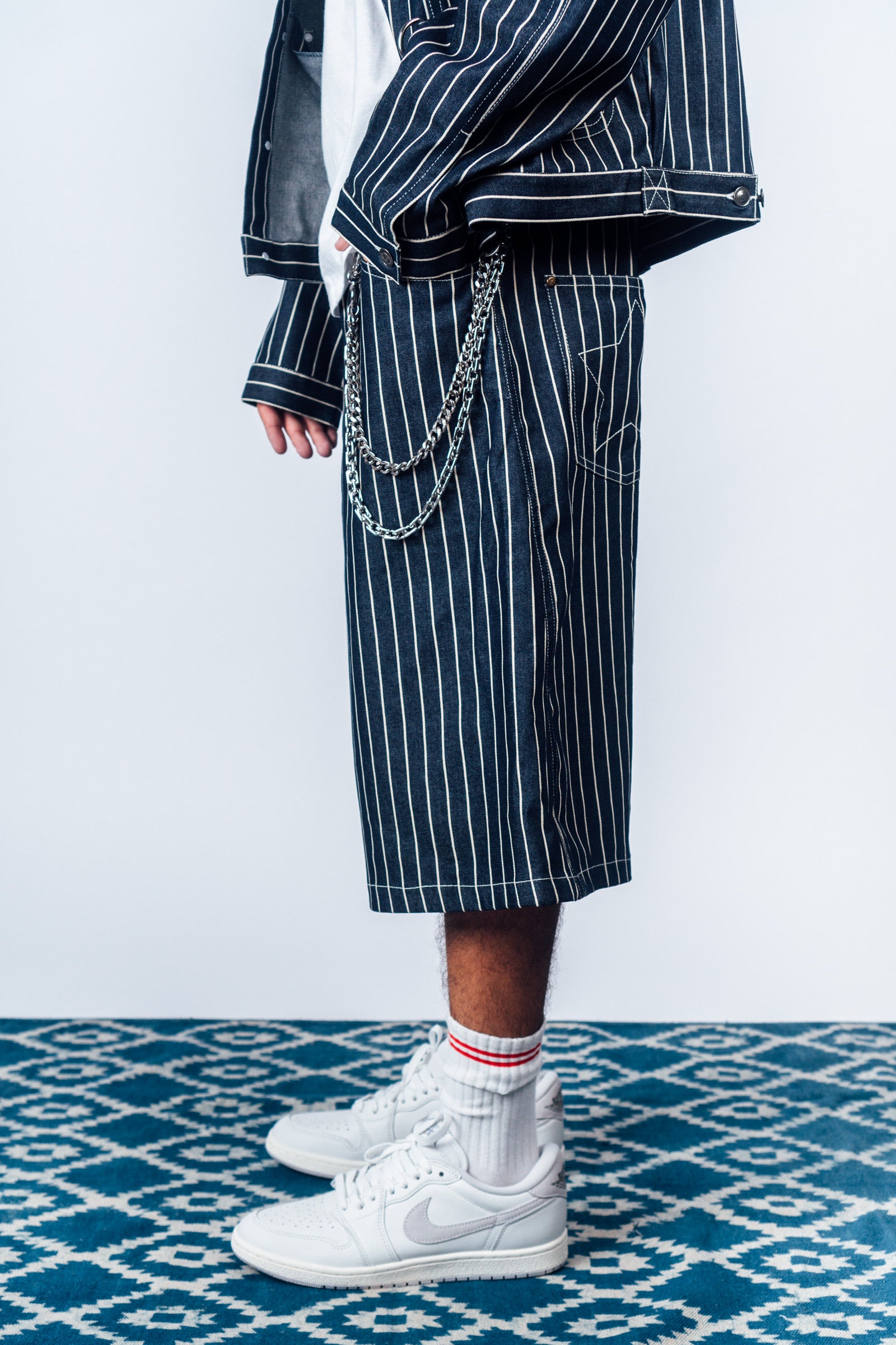 Our Jorts - based off our best-selling Horseshoe jeans - have a longer inseam that can just as easily be worn to the beach or with heels for an evening out. These bermuda shorts have a classic pinstripe pattern. We love these shorts paired with our shirt or any front tie top. Forever cool and sporty, these shorts deserve a spot in every denim drawer. Made of Cotton deadstock denim, these are Unisex and fit true to size.
