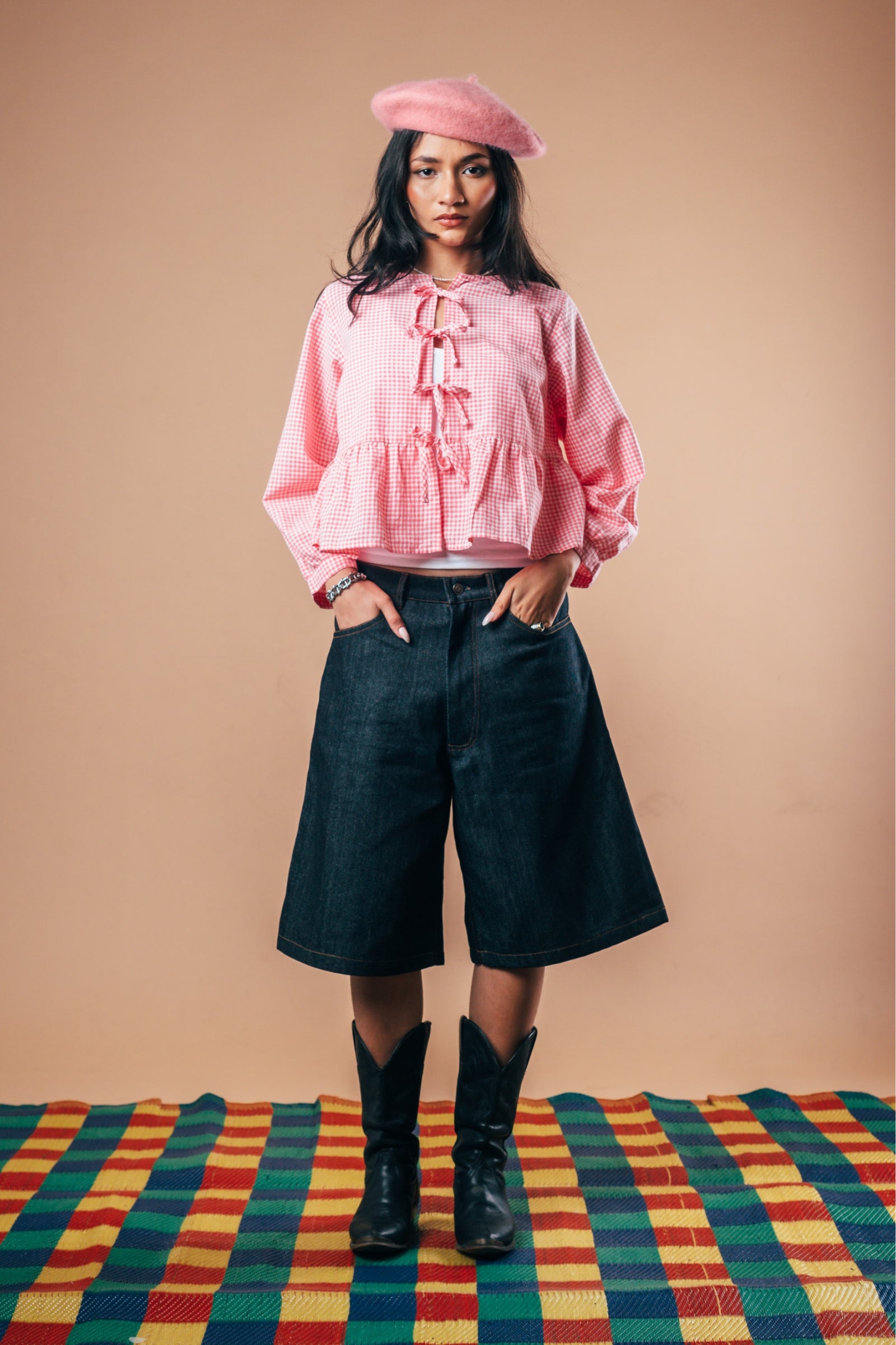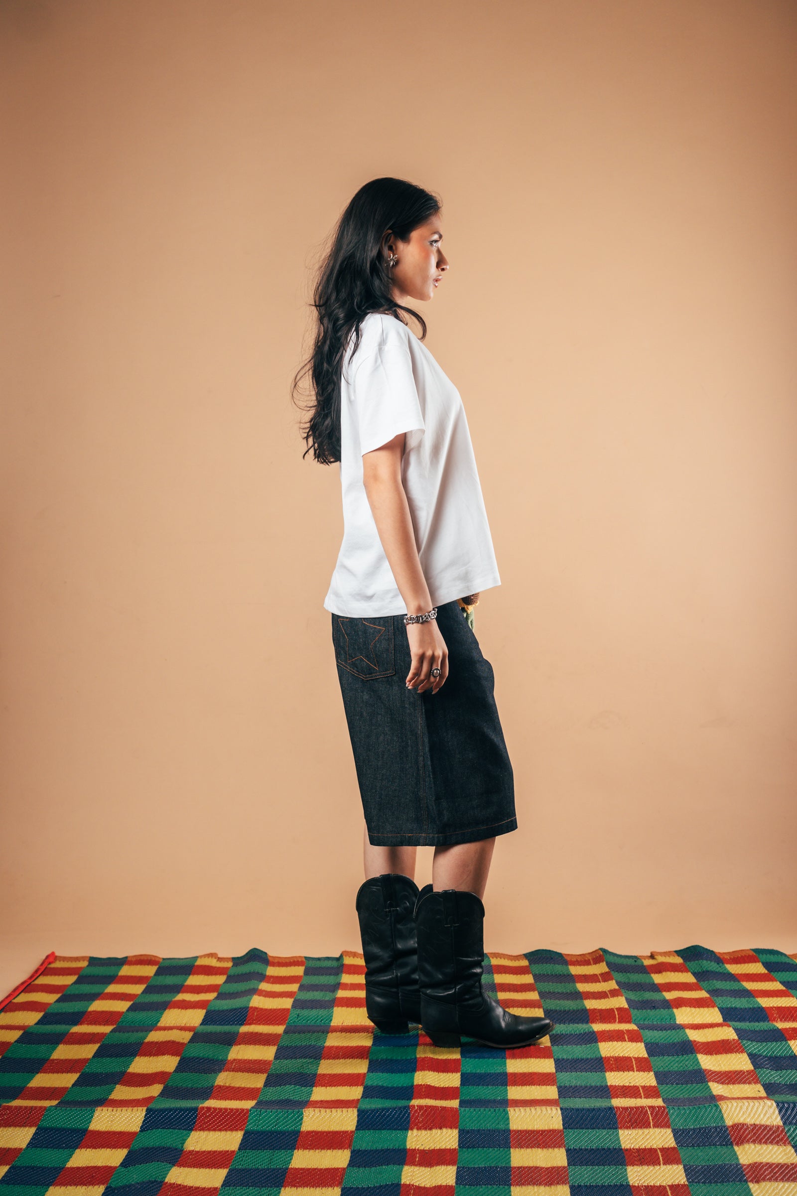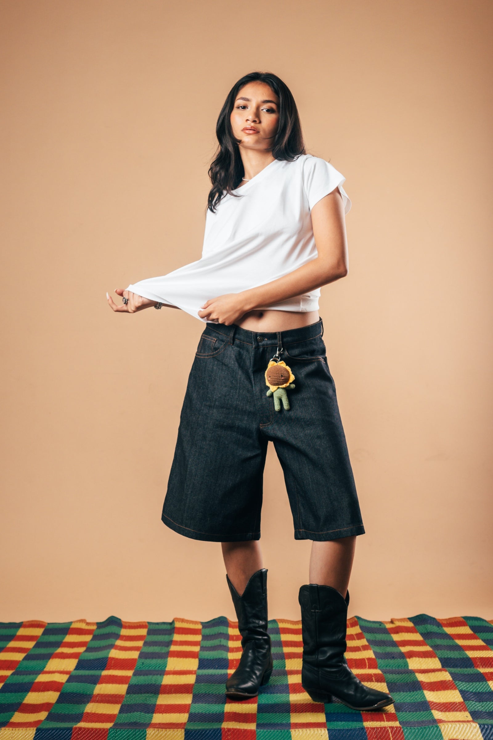 Our Jorts - based off our best-selling Horseshoe jeans - have a longer inseam that can just as easily be worn to the beach or with heels for an evening out. We love these shorts paired with our shirt or any front tie top. Forever cool and sporty, these shorts deserve a spot in every denim drawer. Made of Cotton deadstock denim, these are Unisex and fit true to size.