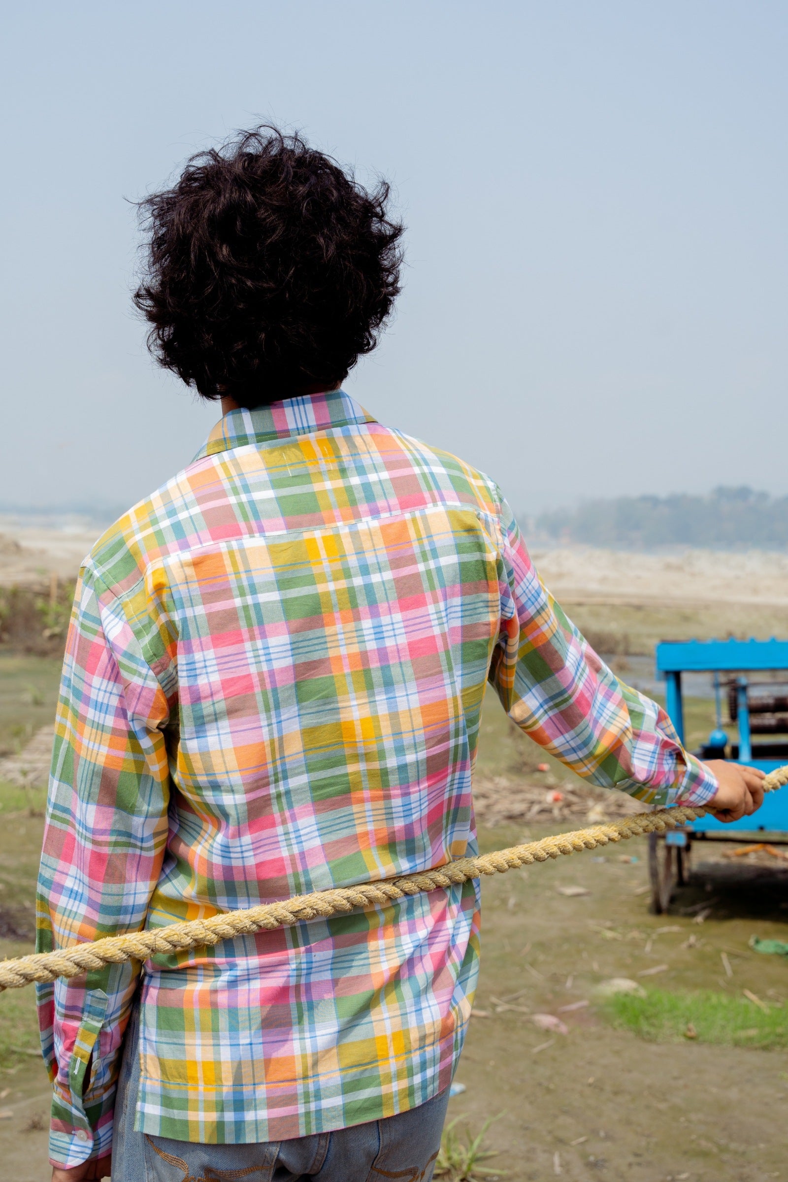 Long-sleeve button down featuring 'Madras Checks', a retro camp collar and Mother Of Pearl buttons for a solid look. Made using 100% deadstock, surplus mill fabric. Pair it with any light blue denims from your wardrobe for a funky summer look.