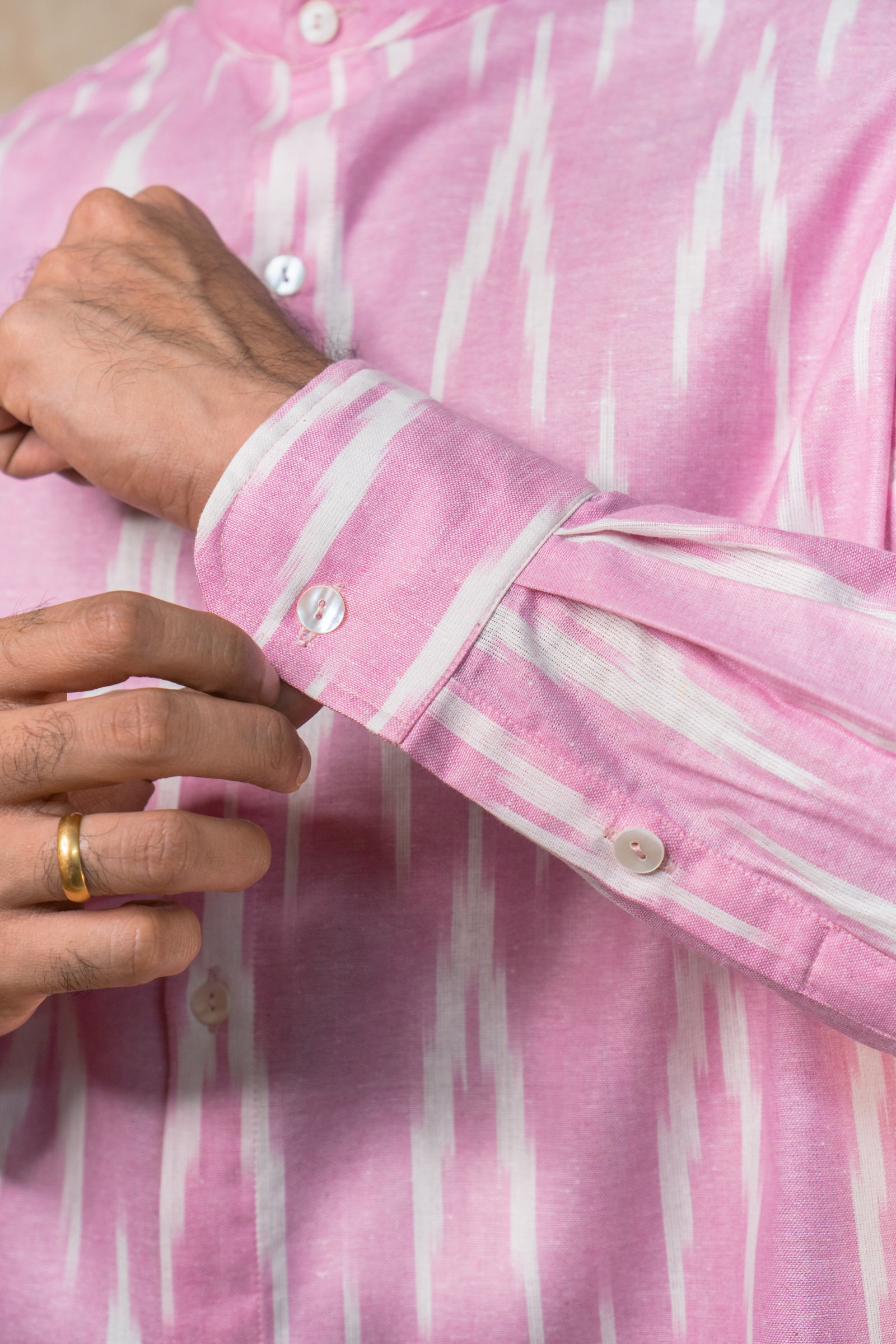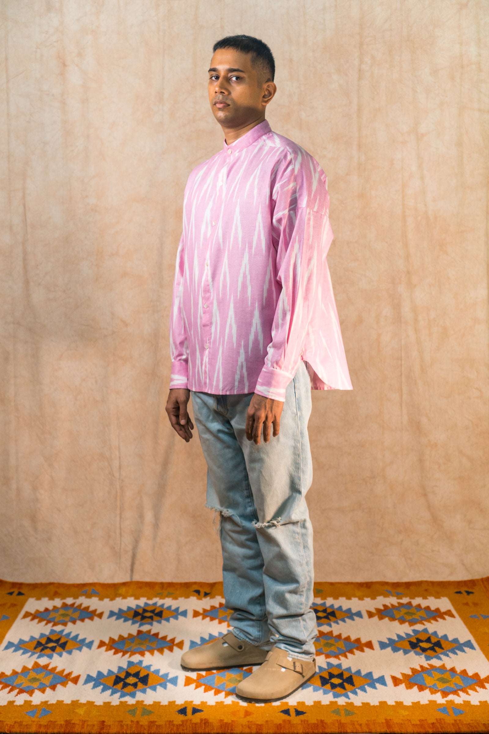 This oversized Ikat shirt features a drop-shoulder design, a curved hem with a band collar and an inverted box pleat at the back.