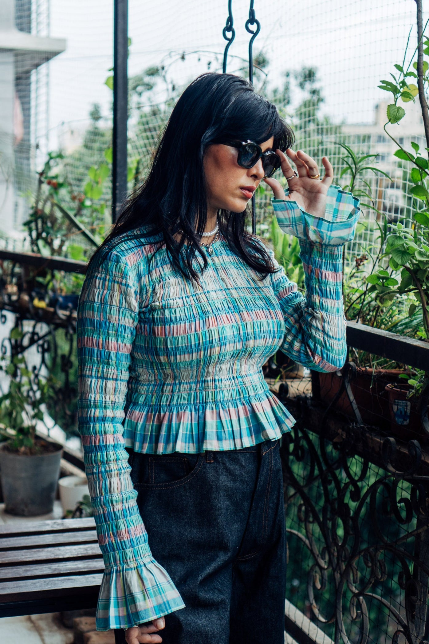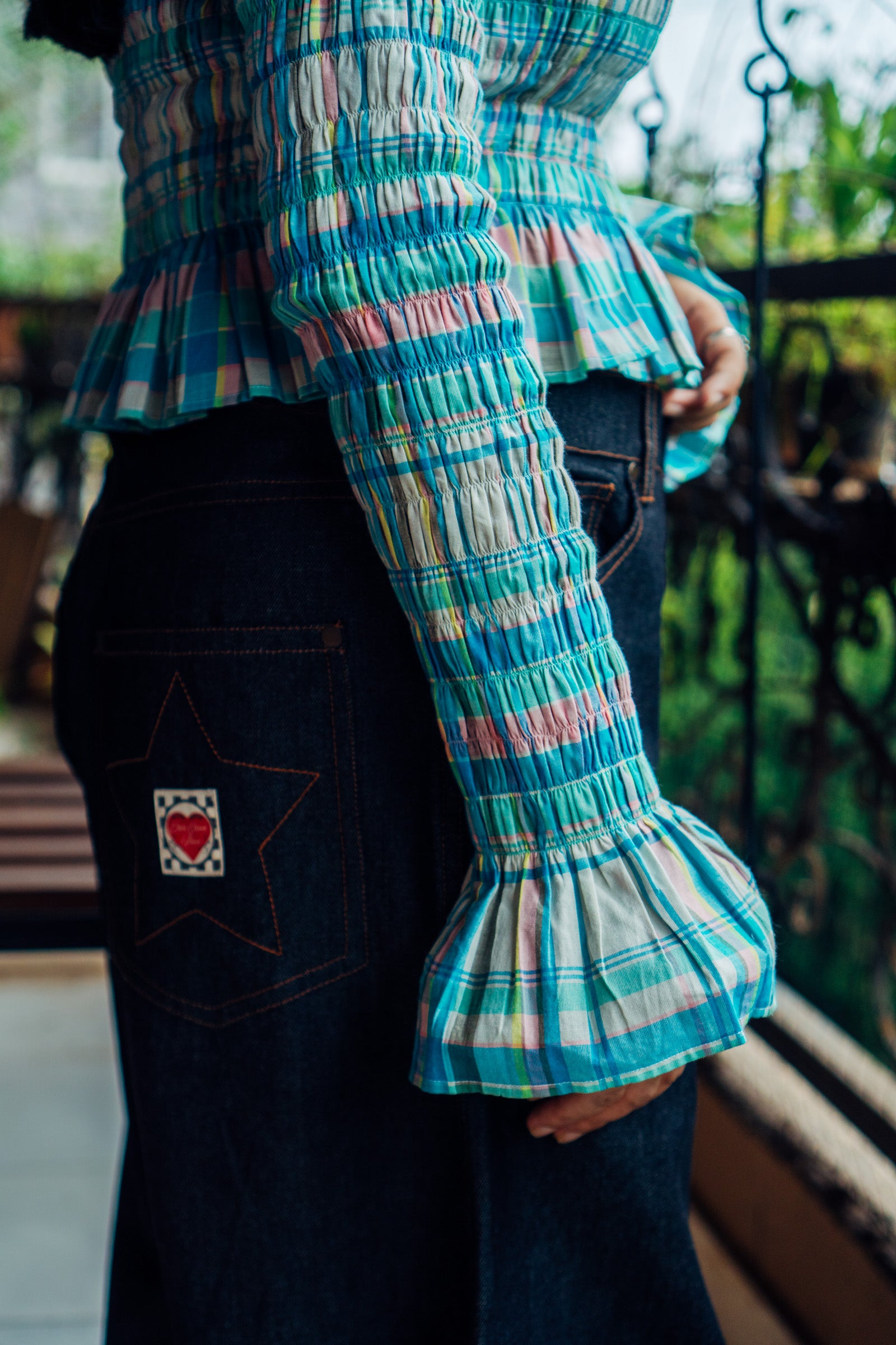 A cropped, fitted top with frill finishes, sewn with elastic thread across the entire body to stretch across the bust, waist and hem - creating a flattering silhouette without compromising on comfort. Featuring a round neckline and Mother Of Pearl Button closure at the back. The peplum hem is the perfect finishing touch on this fun and feminine top. Pair with any of our Horseshoe Jeans, Jorts or the matching 'Madras Magic' tiered skirt for a fun look.