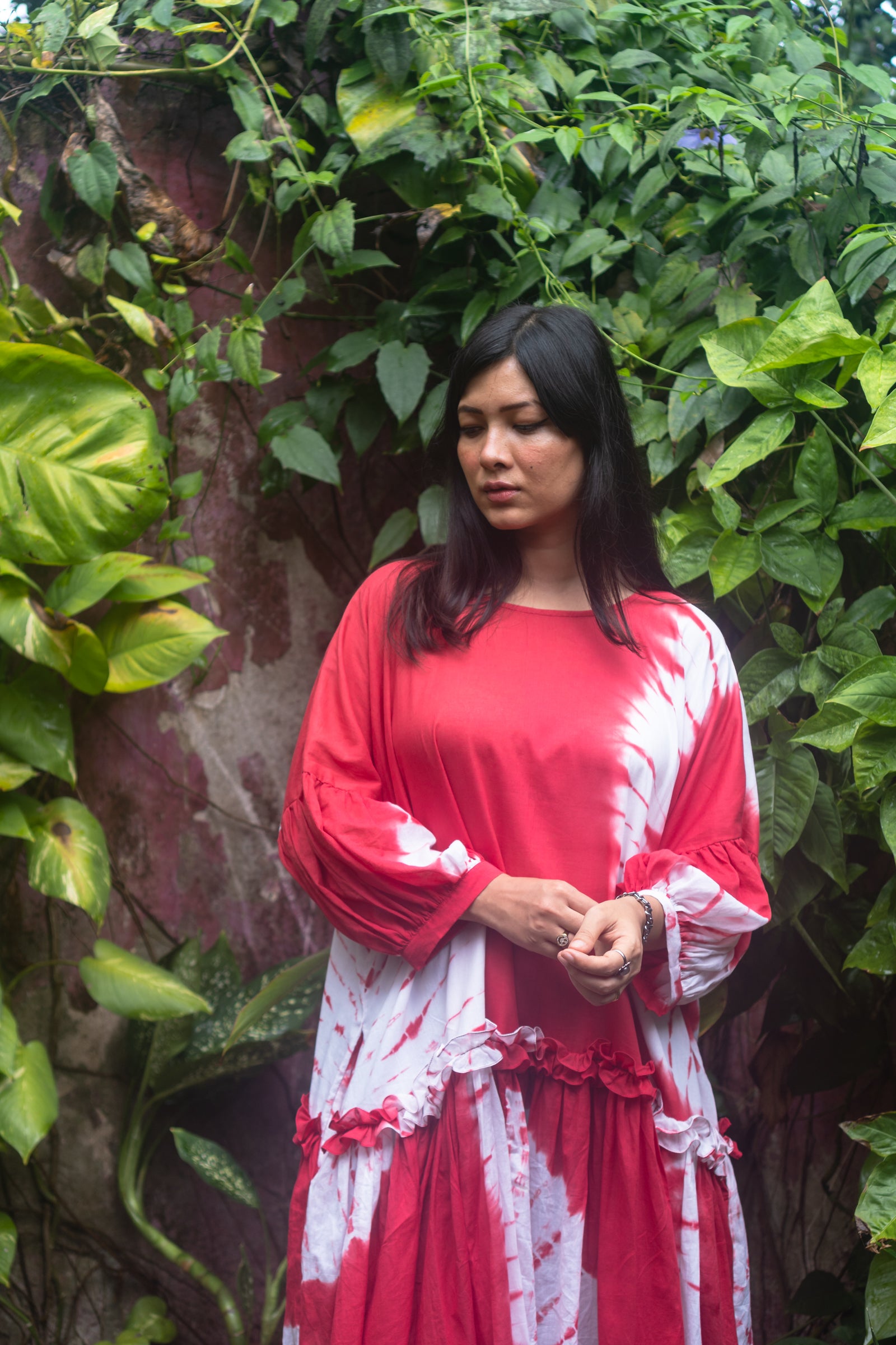 This floaty free-size dress is what we imagine as the ideal summer dress. This dress is handcrafted in pure cotton and is hand Tie-Dyed using Natural Dye by our artisan partner in Rajasthan. It features a relaxed fit and balloon sleeves and comes lined with Mul cotton & two in-seam pockets on either side. For those carefree beach days as well as days when you want to make a statement, this vibrant dress is a must have!