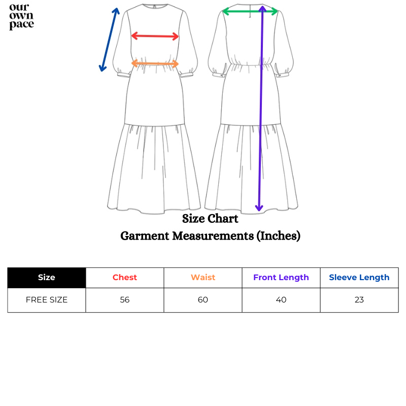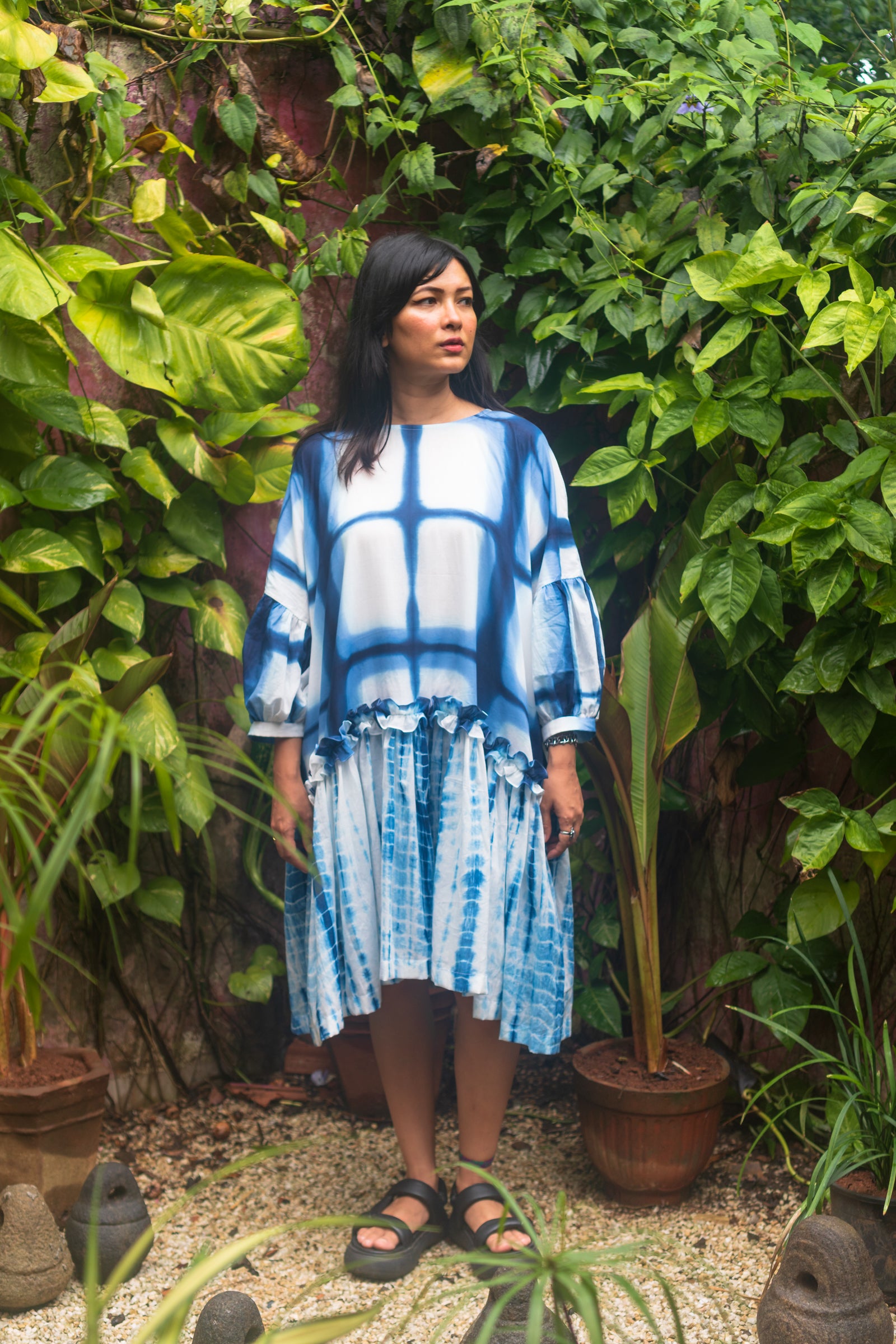 This floaty free-size dress is what we imagine as the ideal summer dress. This dress is handcrafted in pure cotton and is hand Tie-Dyed using Natural Dye by our artisan partner in Rajasthan. It features a relaxed fit and balloon sleeves and comes lined with Mul cotton & two in-seam pockets on either side. For those carefree beach days as well as days when you want to make a statement, this vibrant dress is a must have!