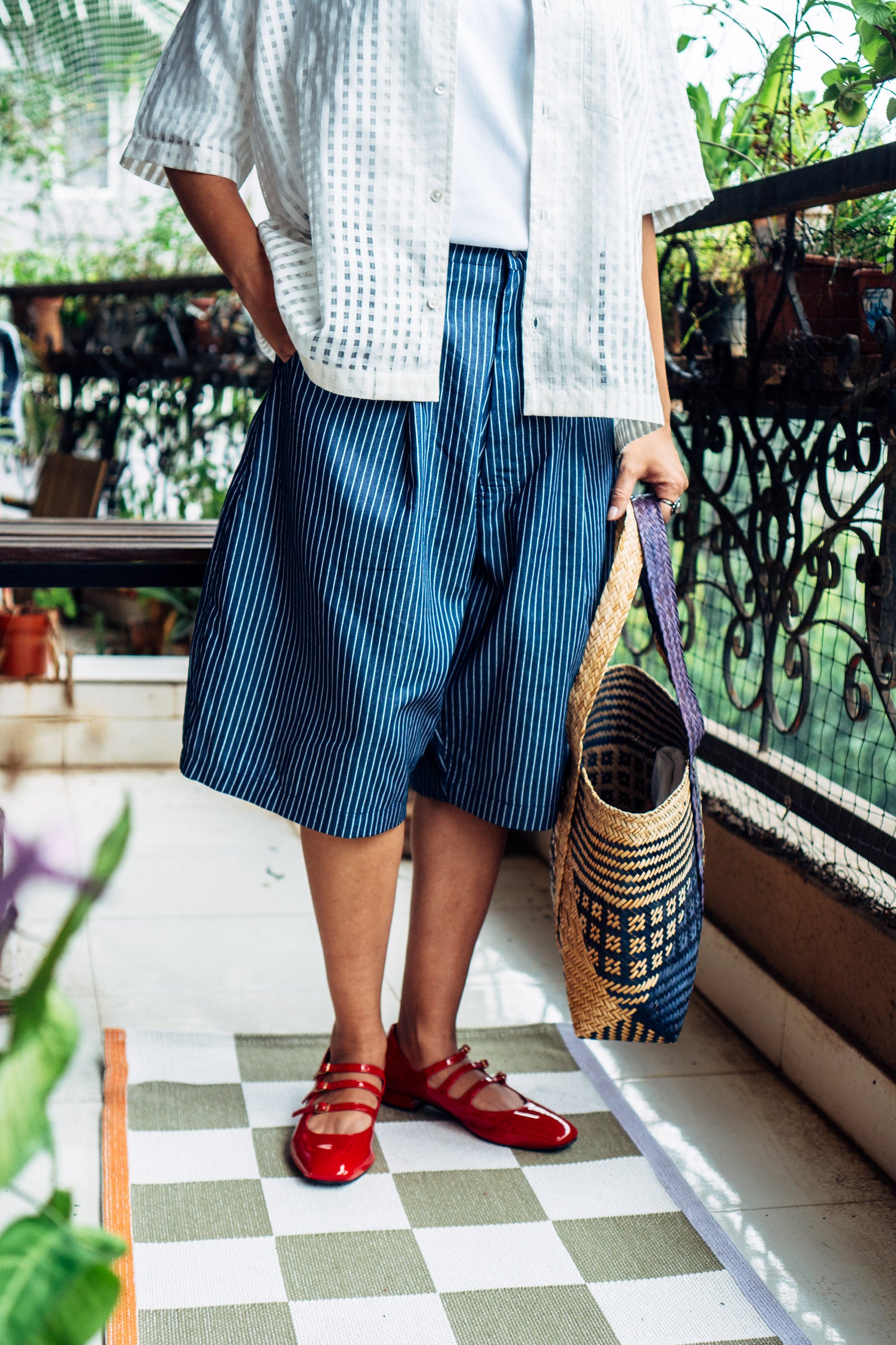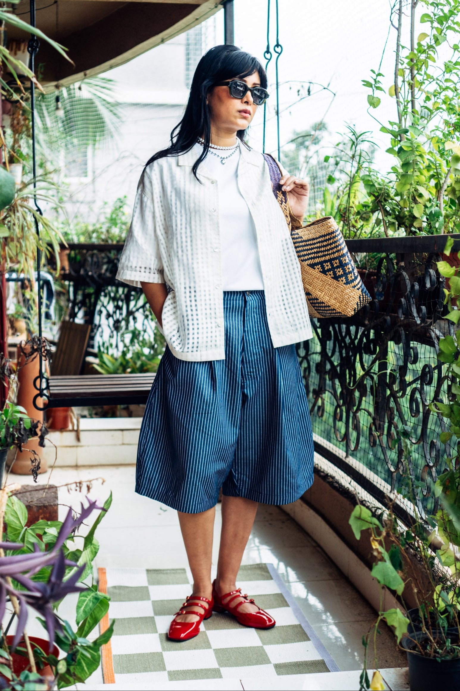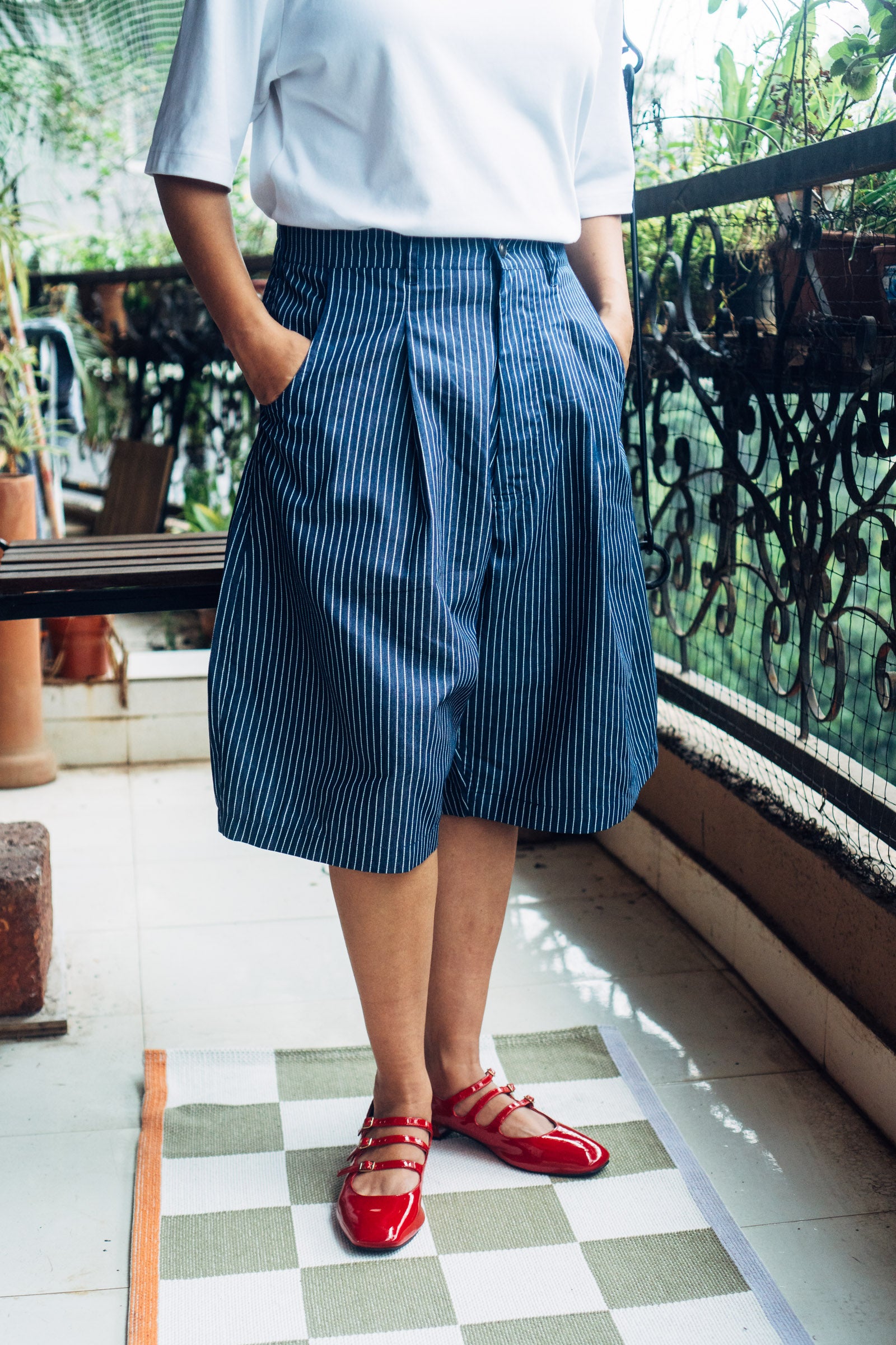Our Really Wide Shorts - based off our best-selling Really Wide Pants - have a longer inseam that can just as easily be worn to the beach or with heels for an evening out. These shorts have a classic pinstripe pattern and love them paired with our shirt or any front tie top. Forever cool and sporty, these shorts deserve a spot in every wardrobe. Made of deadstock Cotton, these are Unisex and fit true to size.
