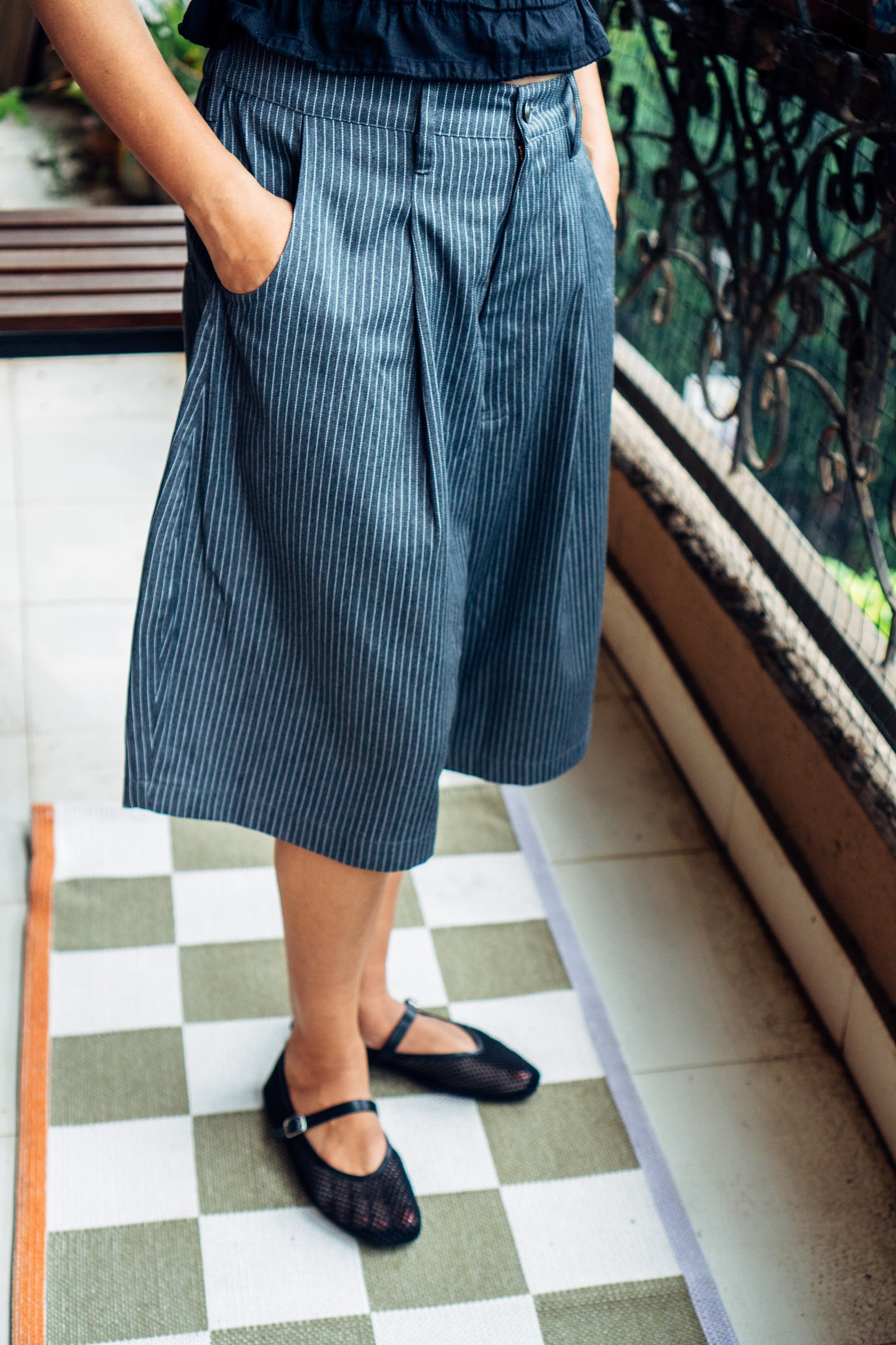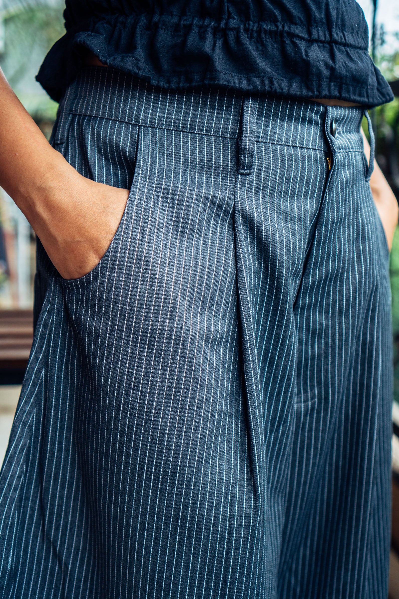 Our Really Wide Shorts - based off our best-selling Really Wide Pants - have a longer inseam that can just as easily be worn to the beach or with heels for an evening out. These shorts have a classic pinstripe pattern and love them paired with our shirt or any front tie top. Forever cool and sporty, these shorts deserve a spot in every wardrobe. Made of Deadstock Cotton, these are Unisex and fit true to size.
