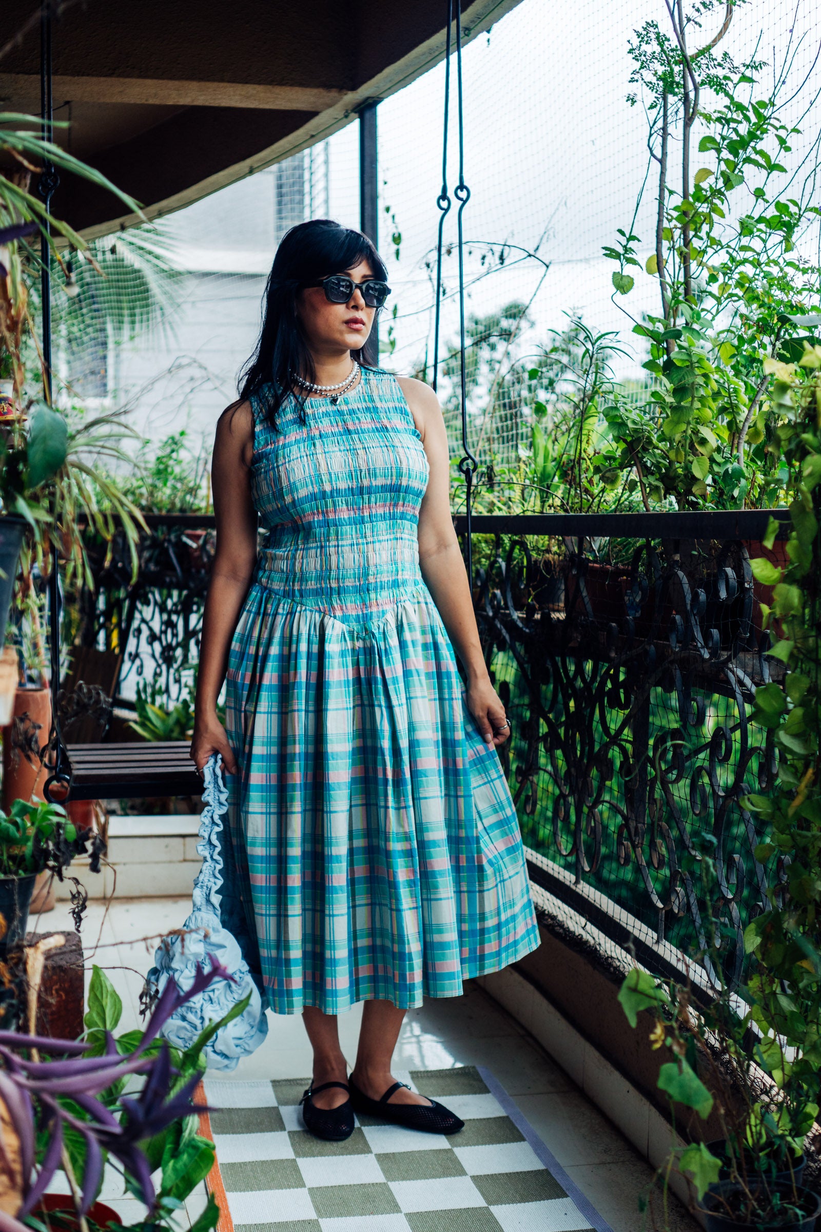 A fitted dress with gathers, sewn with elastic thread across the entire body to stretch across the bust and waist - creating a flattering silhouette without compromising on comfort. Featuring a round neckline, YKK zip closure at the back and side pockets on both sides.