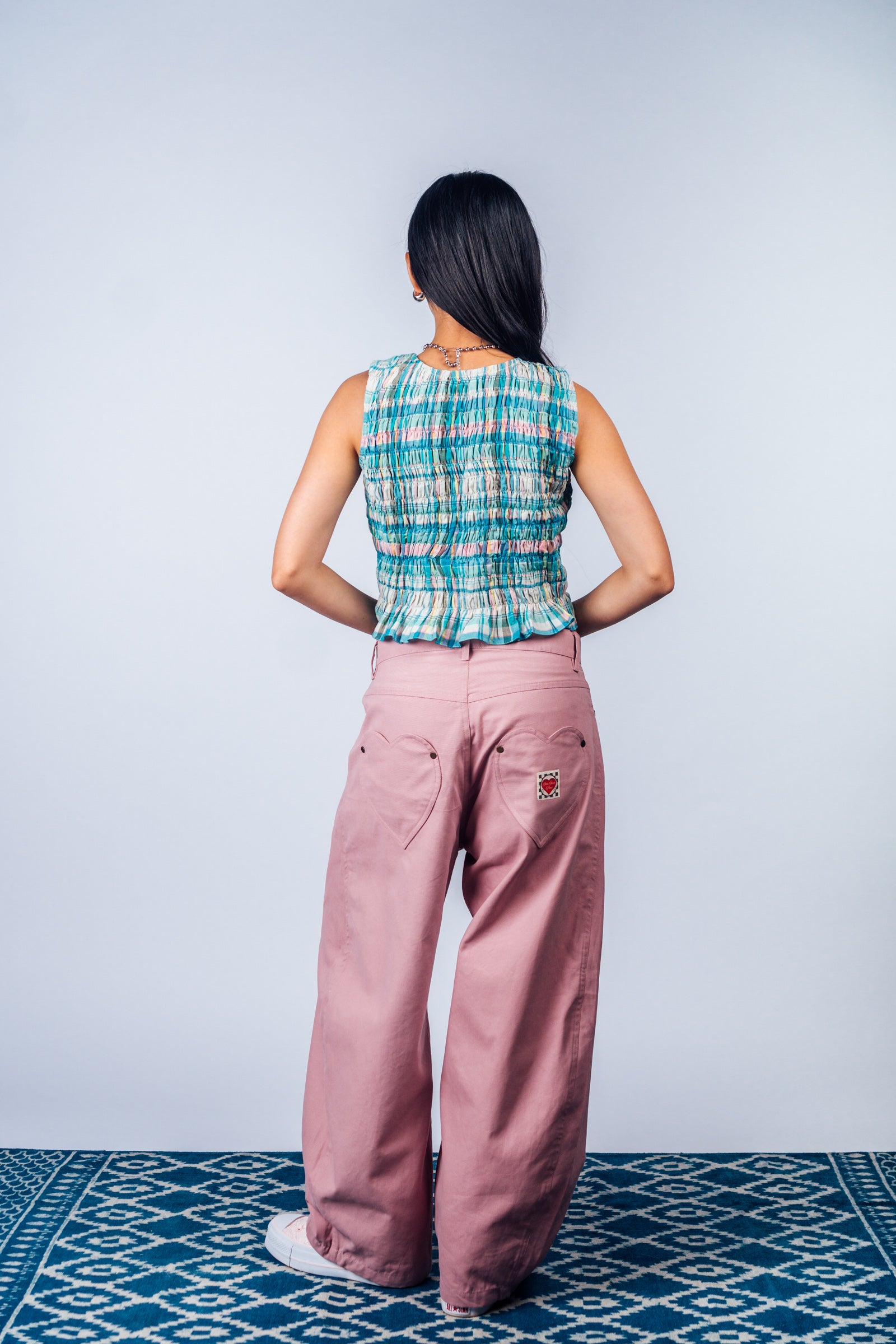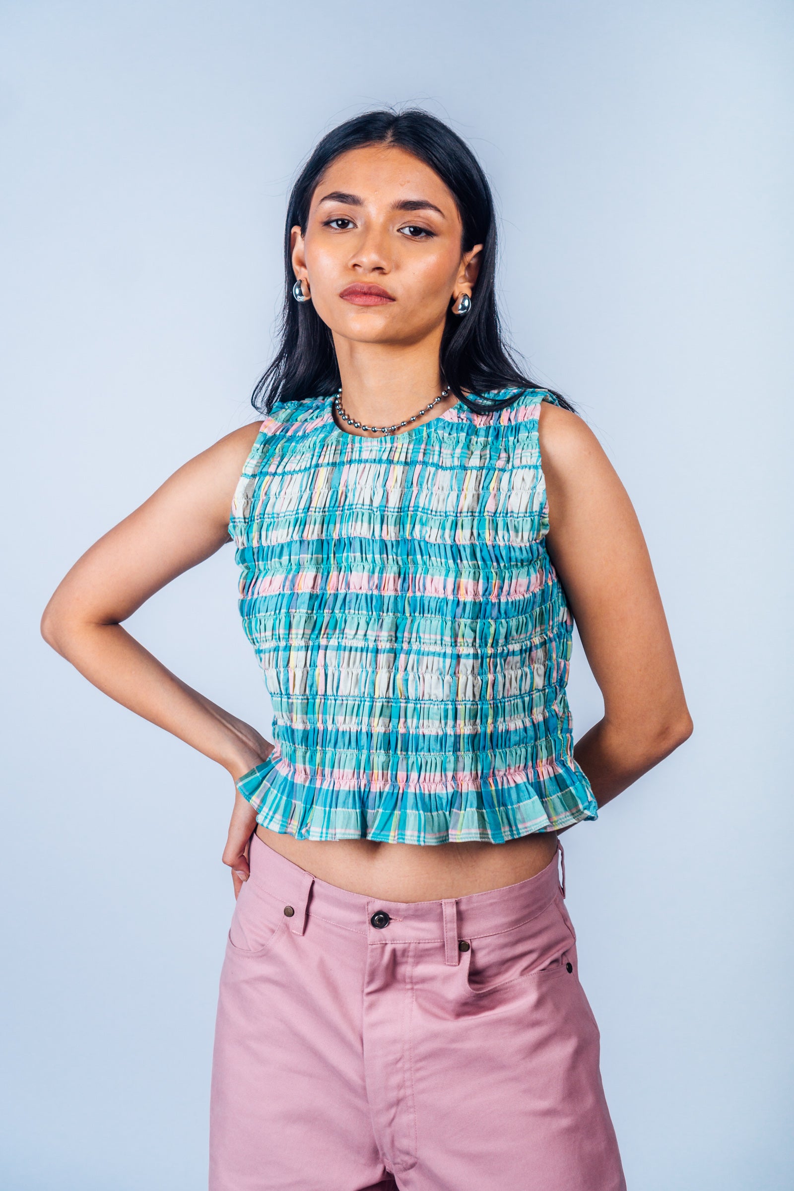 A cropped, fitted top with frill finishes, sewn with elastic thread across the entire body to stretch across the bust, waist and hem - creating a flattering silhouette without compromising on comfort. Featuring a round neckline and left shoulder Mother Of Pearl Button closure. The peplum hem is the perfect finishing touch on this fun and feminine top. Pair with any of our Horseshoe Jeans, Jorts or the matching 'Madras Magic' tiered skirt for a fun look.