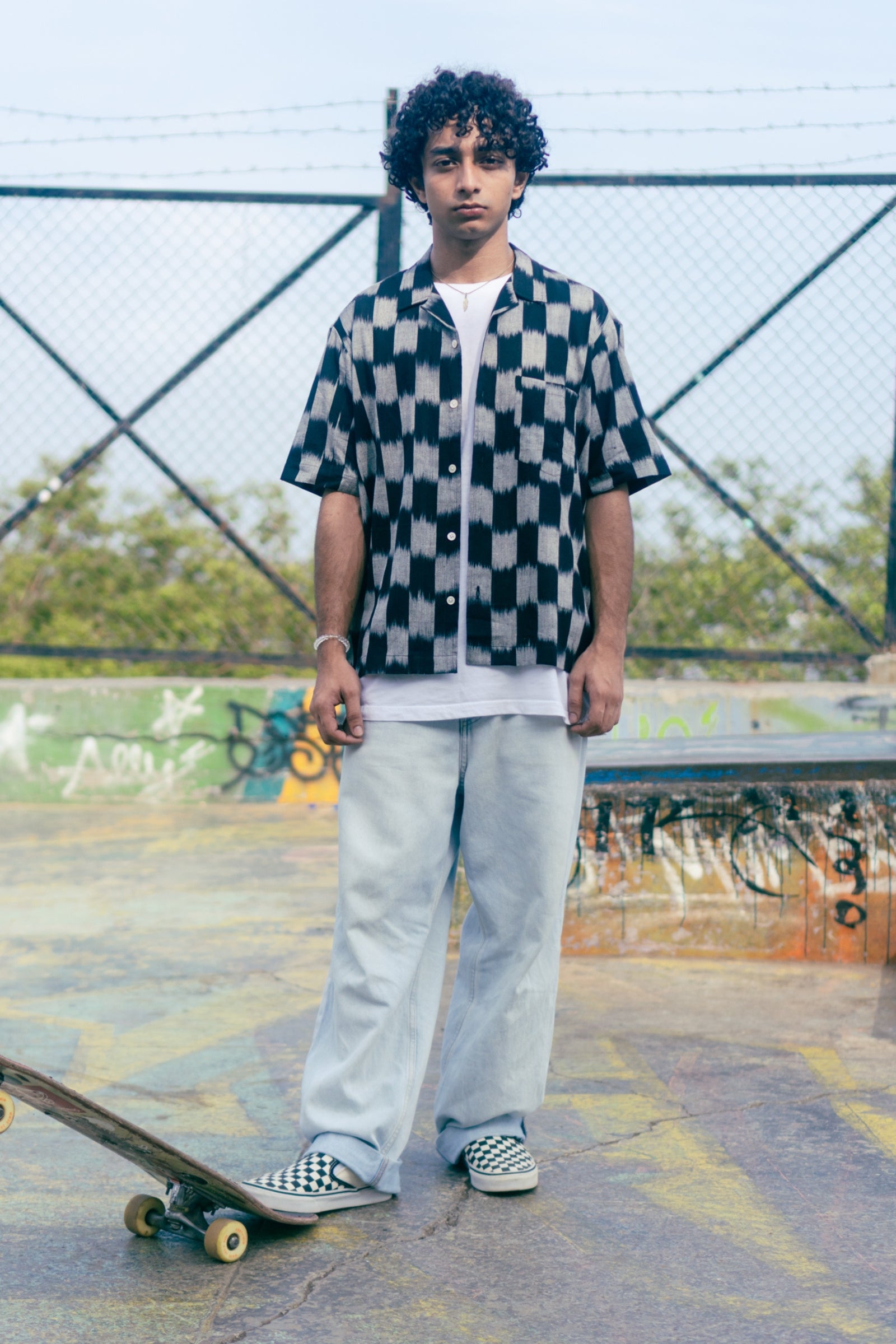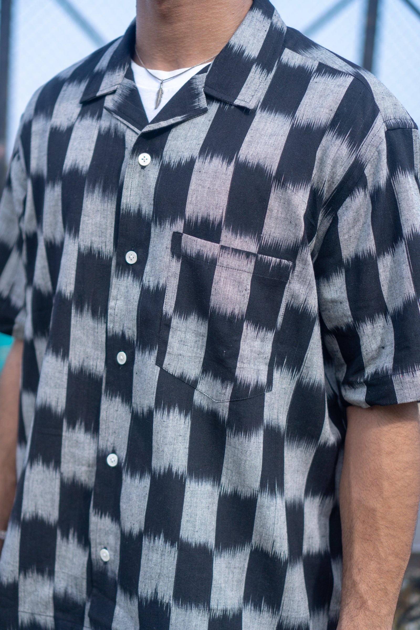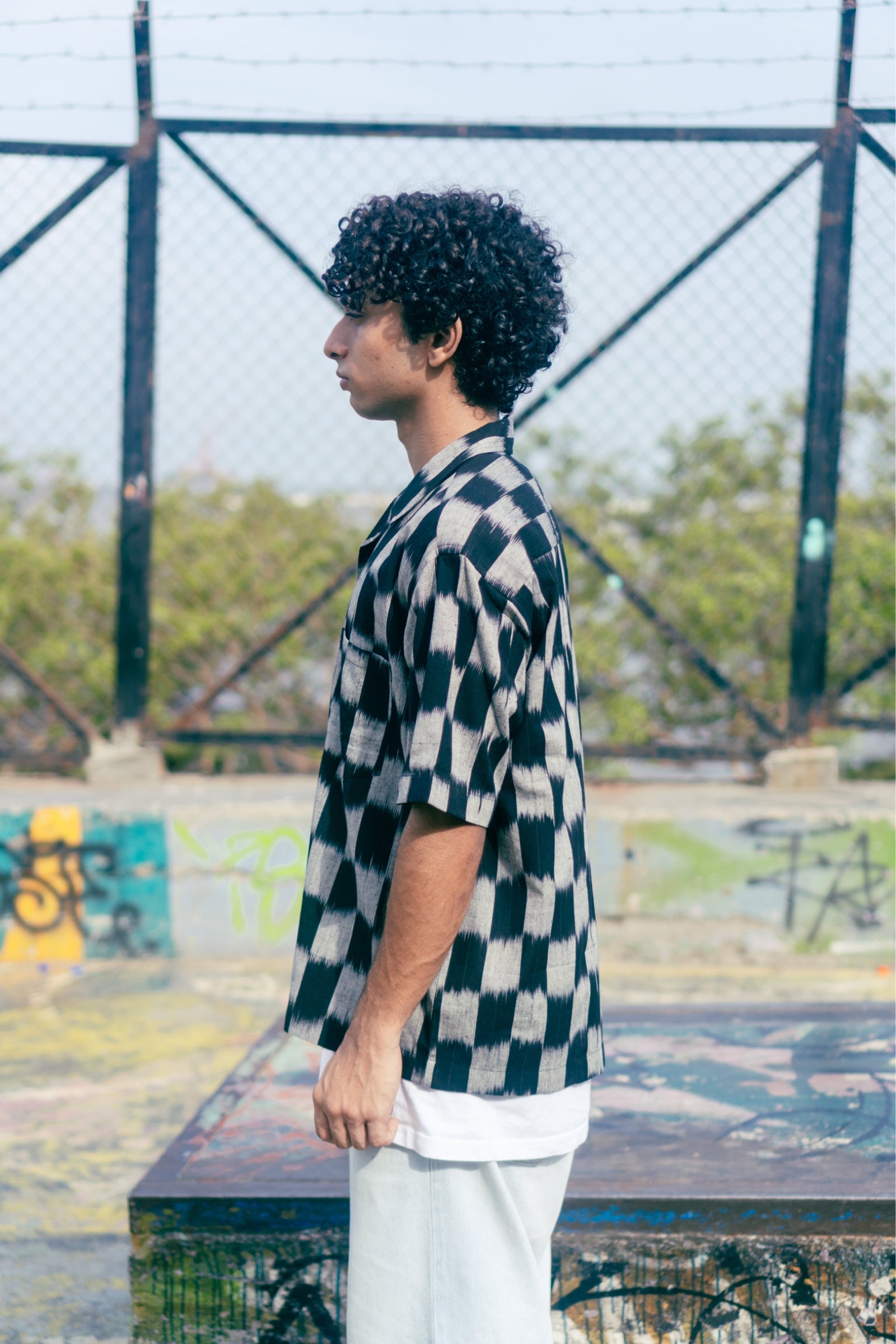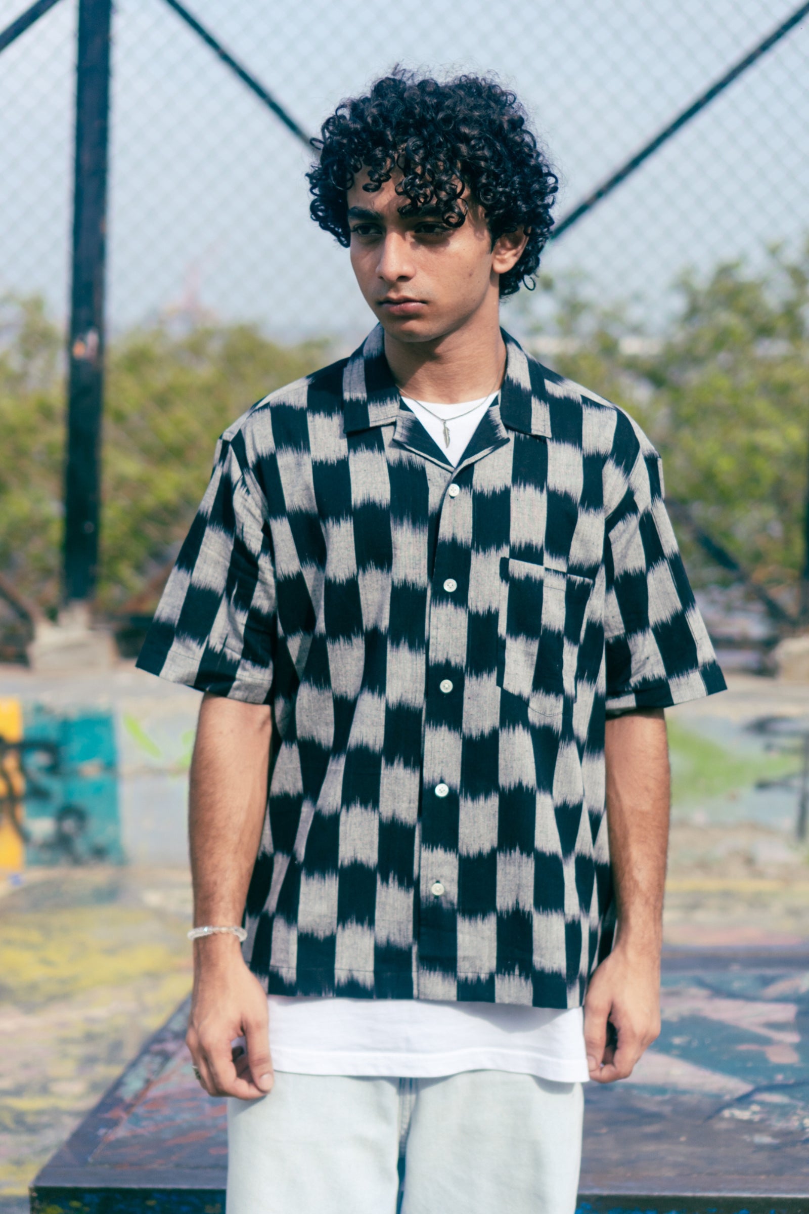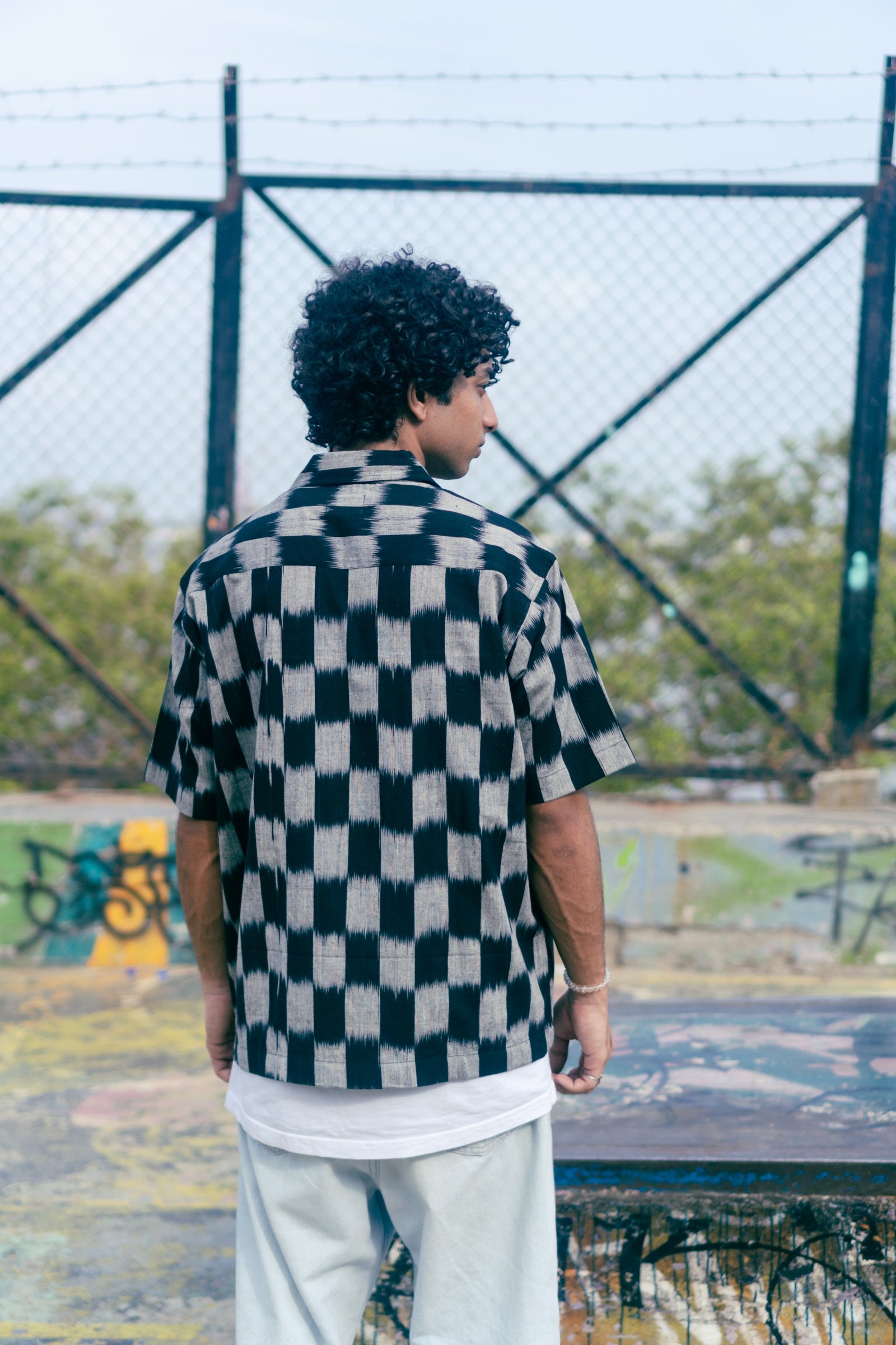 An Ikat button down with a handwoven classic checkerboard design in a boxy silhouette and a retro camp collar for a solid look. Handwoven by our weaving partners in Telangana, it's a lightweight shirt for the summer.