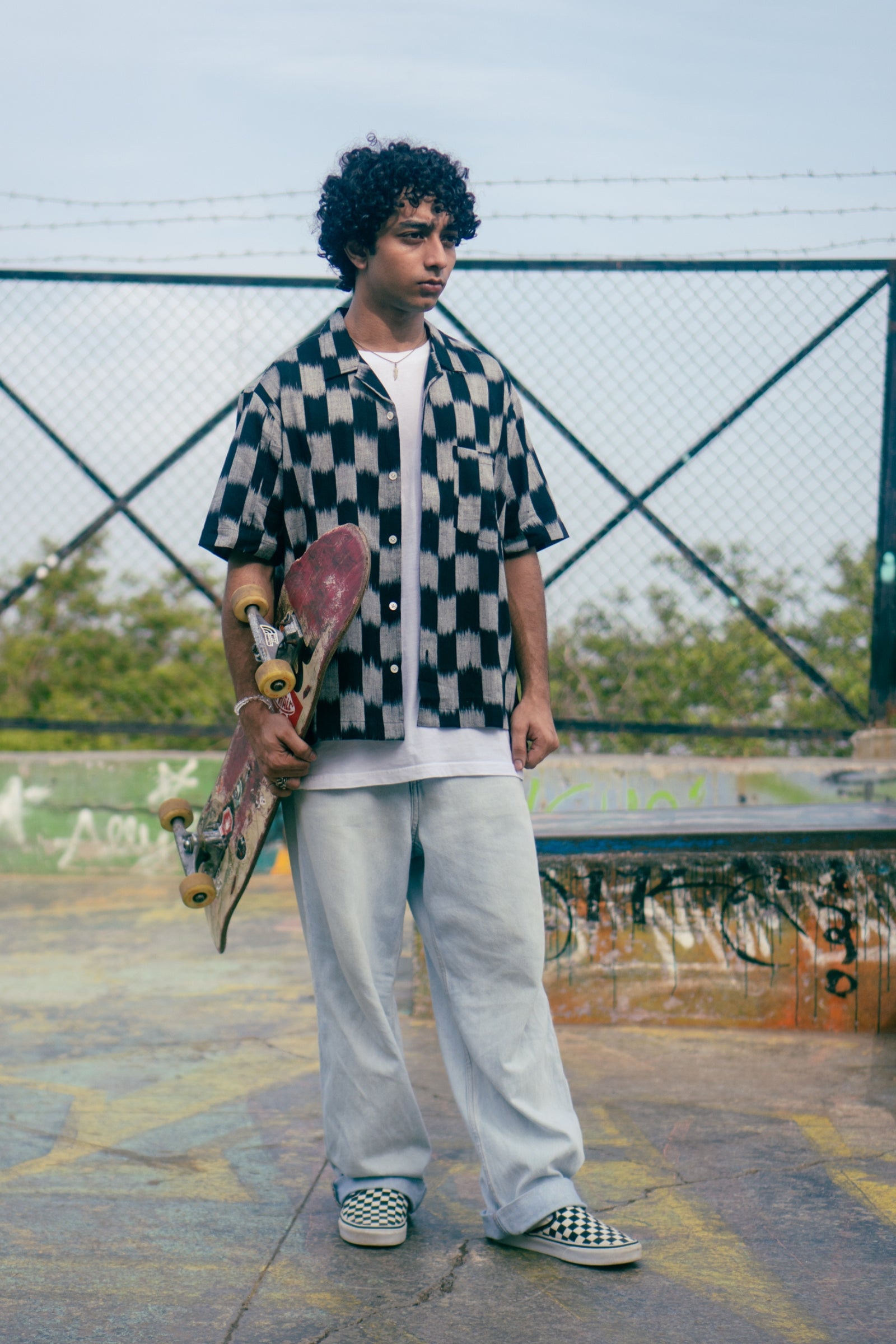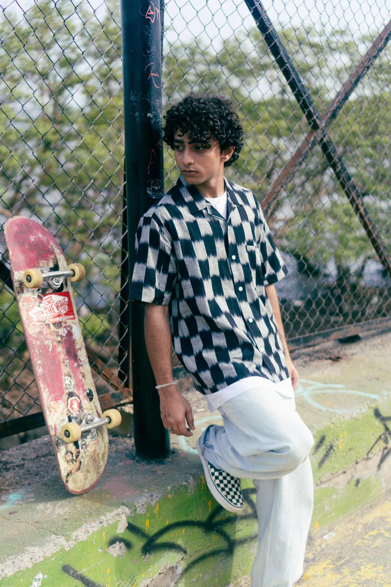 We sourced this Ikat fabric as it evokes the iconic checkerboard pattern popularized by Vans. This classic pattern, with its alternating black and white squares, has been a symbol of skate culture and casual style since the late 70s. Its bold, graphic look embodies a sense of rebellion and youthful energy. This handwoven shirt captures that same spirit, offering a modern twist on a beloved classic.