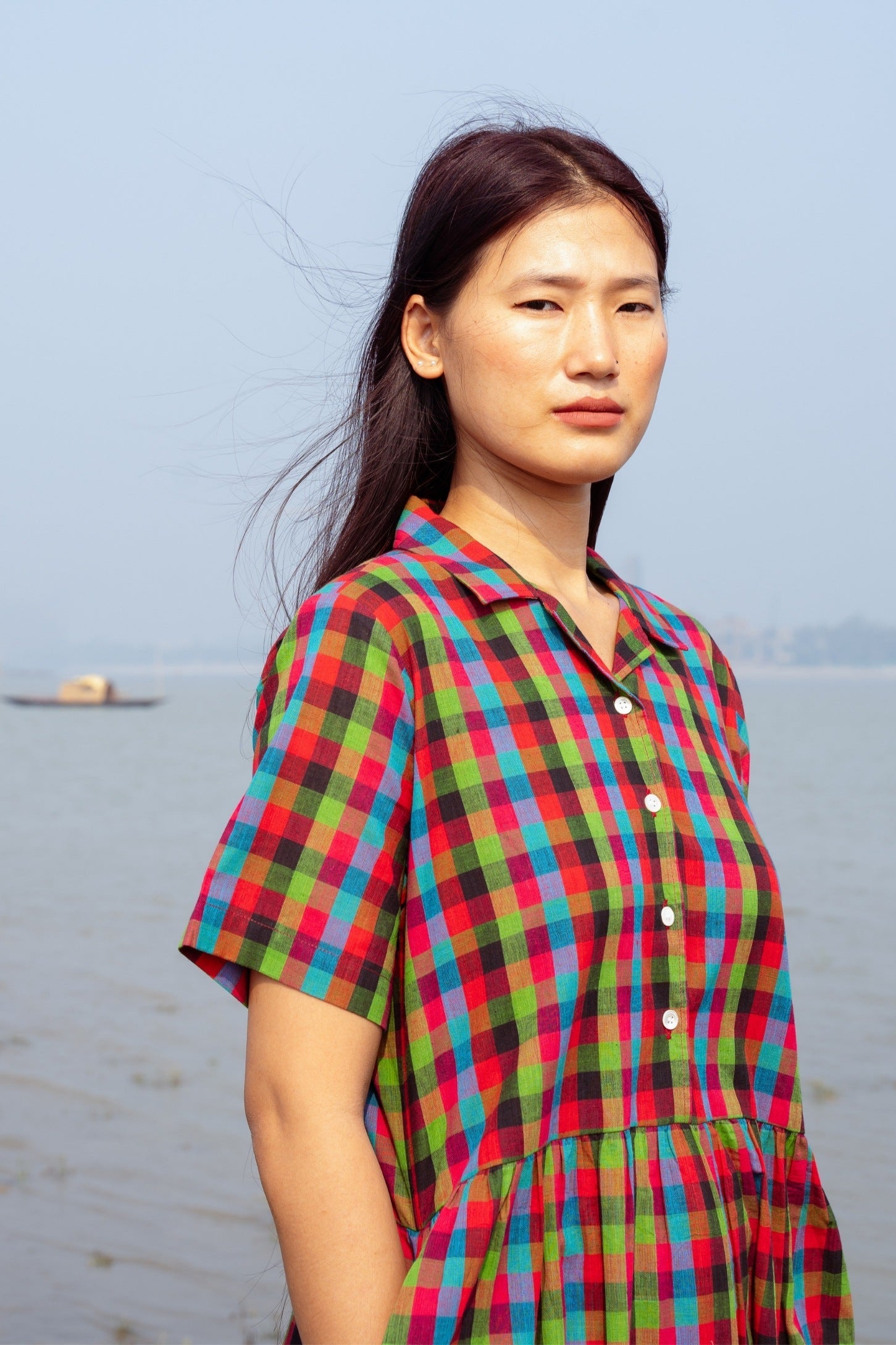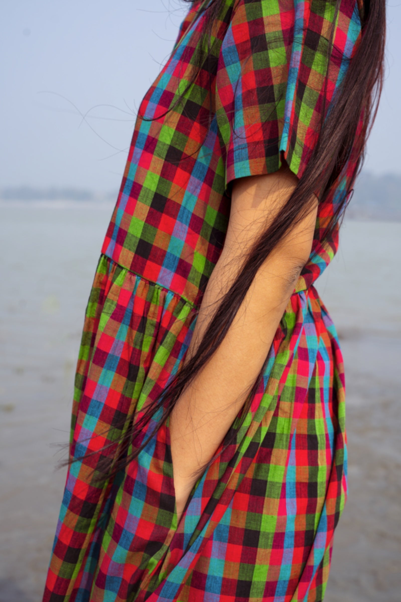 Short sleeved Summer Dress shaped with gathers at the waist and a tier below. It is unlined and has side seam pockets on either side, is comfortable and perfect for the summer. Made using 100% handloom cotton - deadstock, surplus mill fabric.
