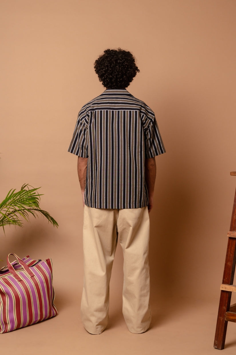 A simple button down with a boxy silhouette that offers a woven striped design, a retro camp collar for a solid look.