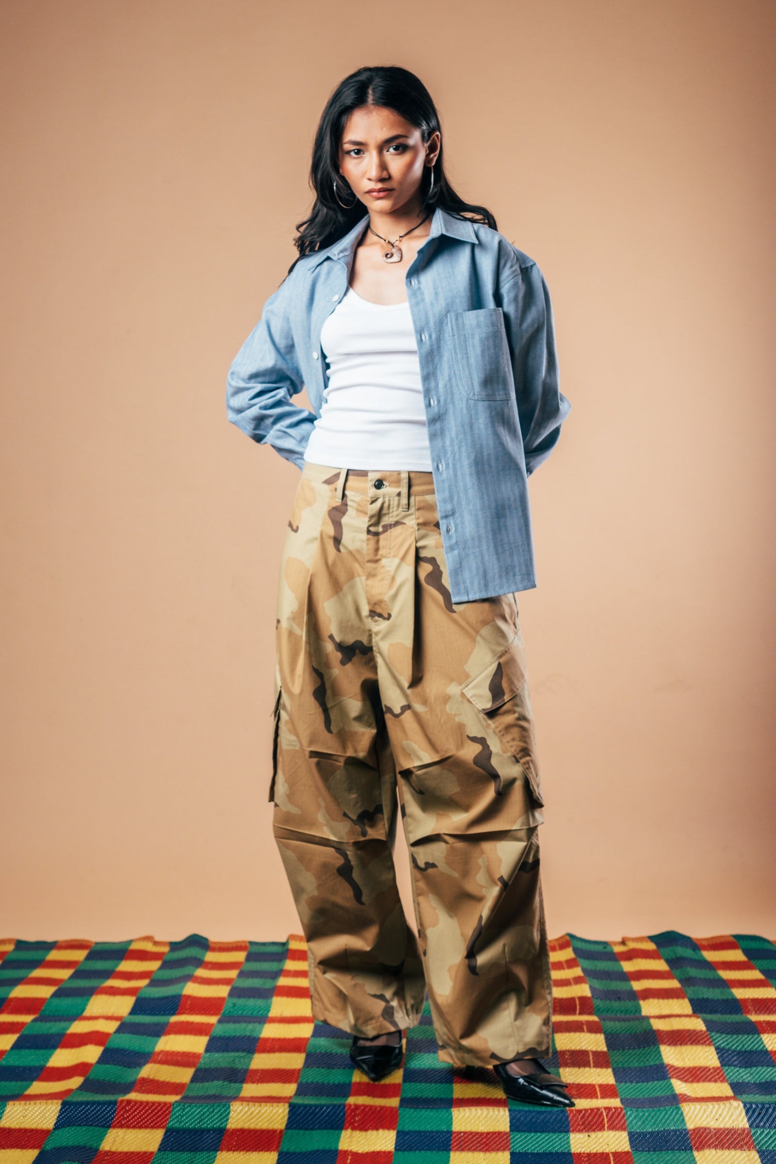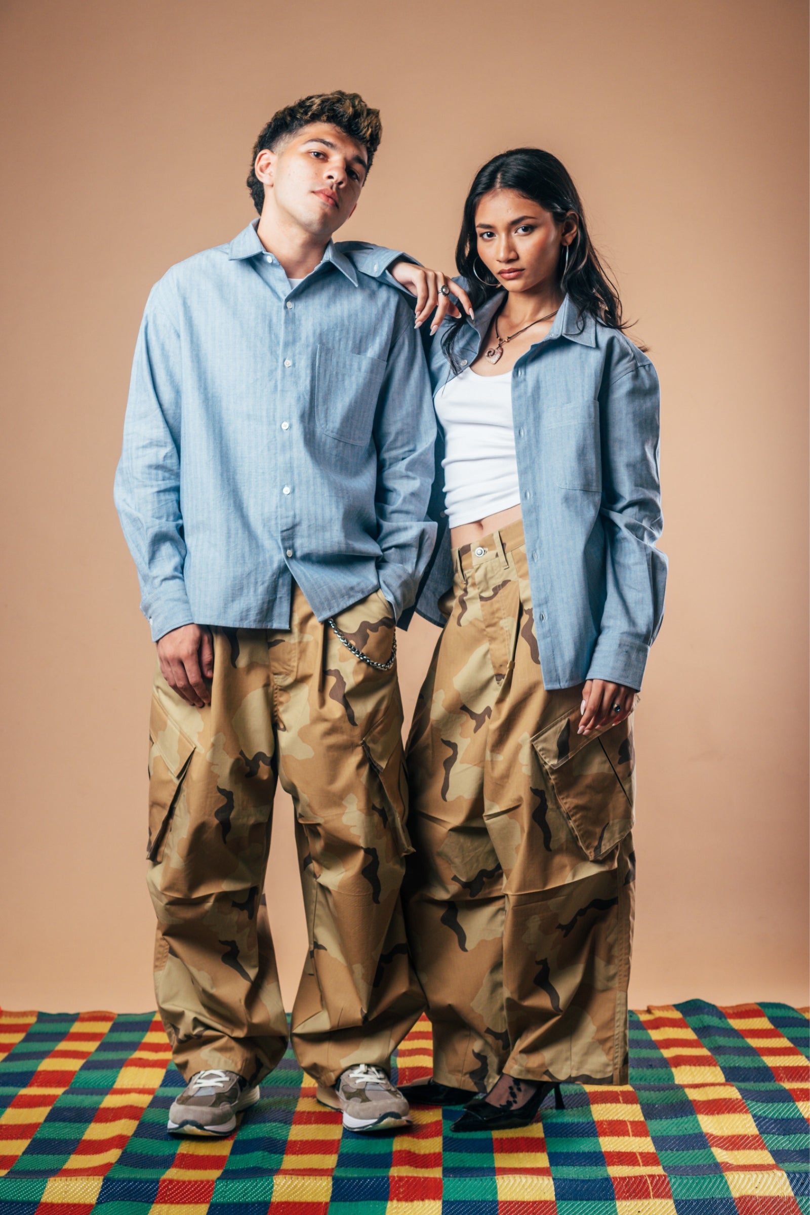 Long-sleeve button down shirt in lightweight cotton denim with a regular collar crafted in Herringbone denim. Features Mother Of Pearl buttons and a curved hem. Take it to work or throw it on before your next grocery run. Pair this with any of our pants for an effortless co-ord look. Made using 100% deadstock, surplus mill fabric.