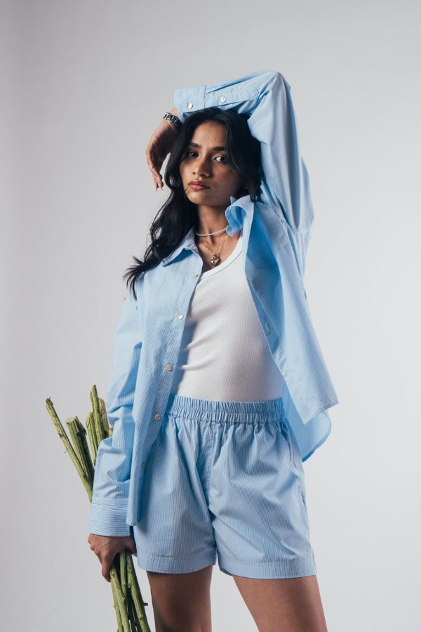 Long-sleeve button down shirt in cotton poplin with a regular collar. Features Mother Of Pearl buttons and a curved hem. Take it to work or throw it on before your next grocery run. Pair this with the shorts from the same collection for an effortless co-ord look. Made using 100% deadstock, surplus mill fabric.