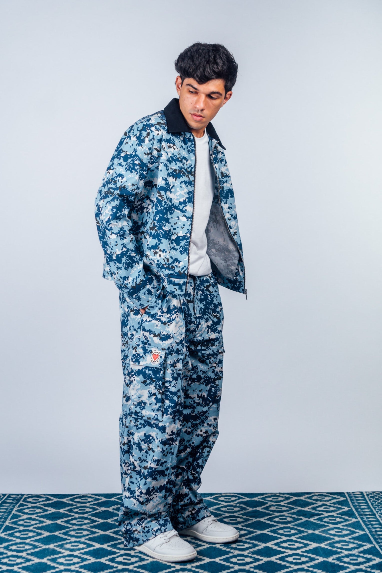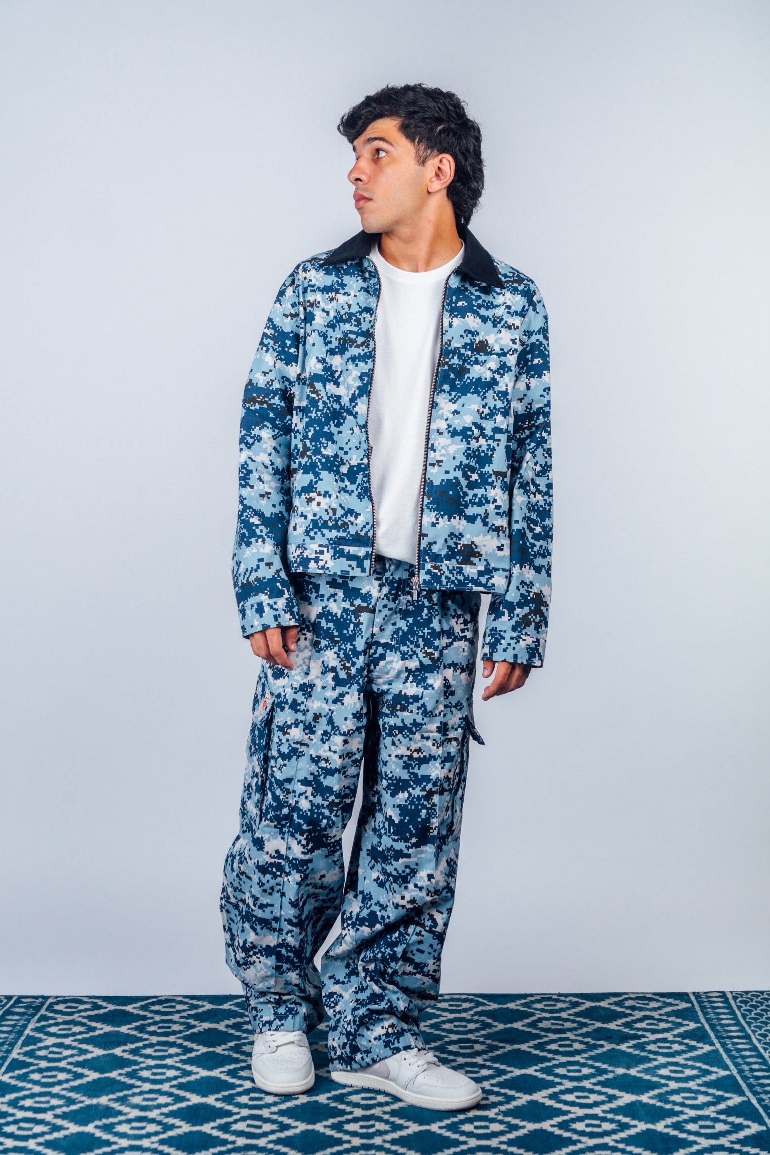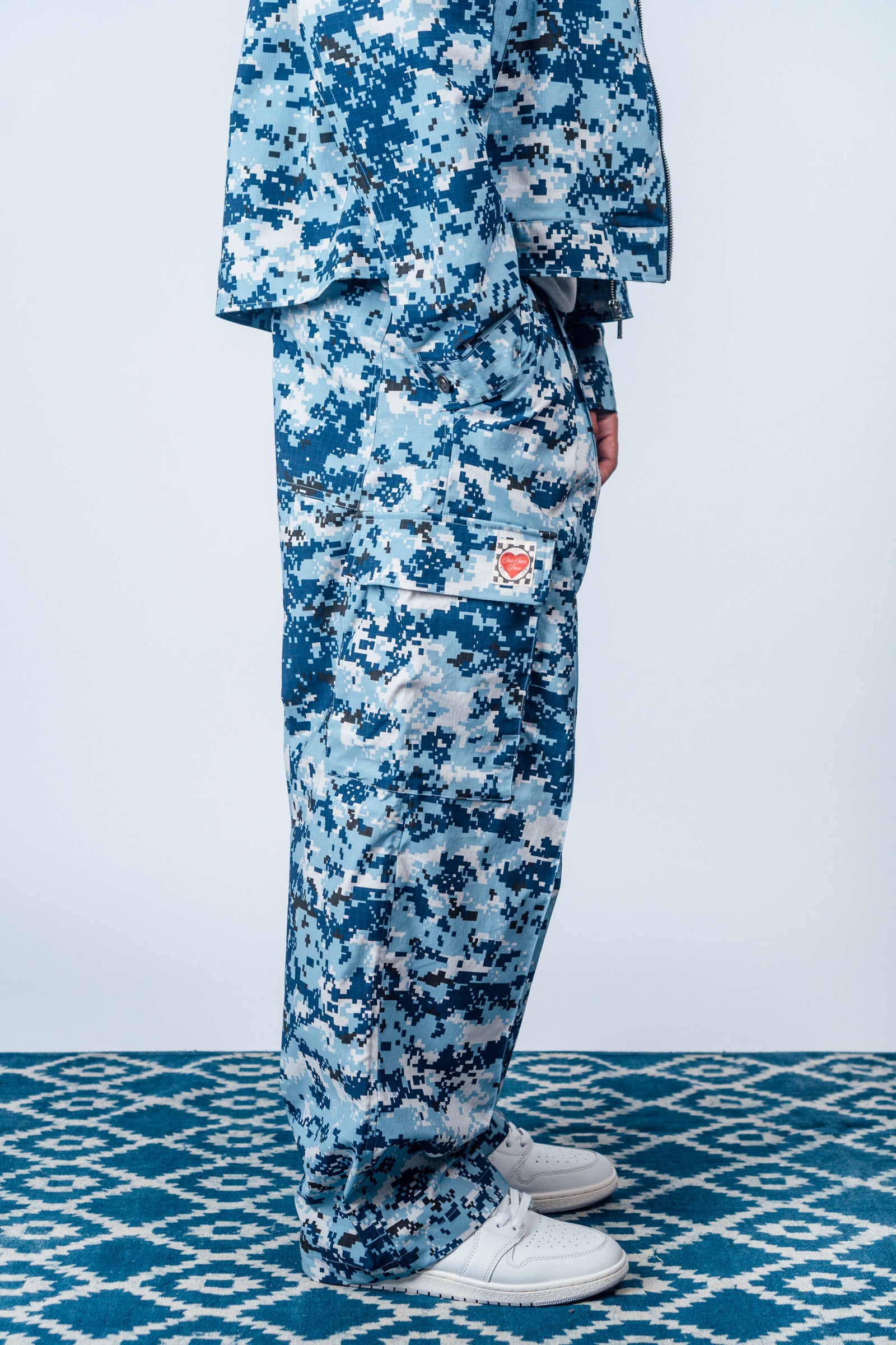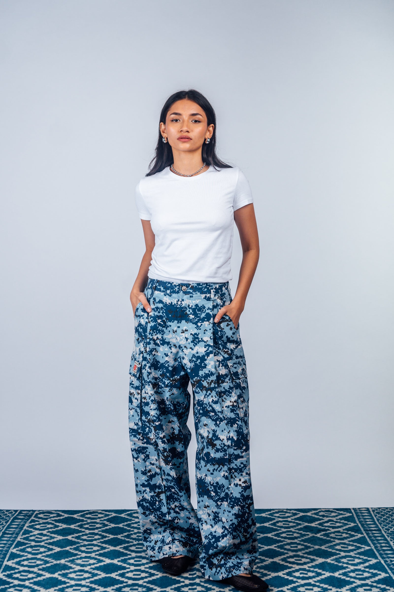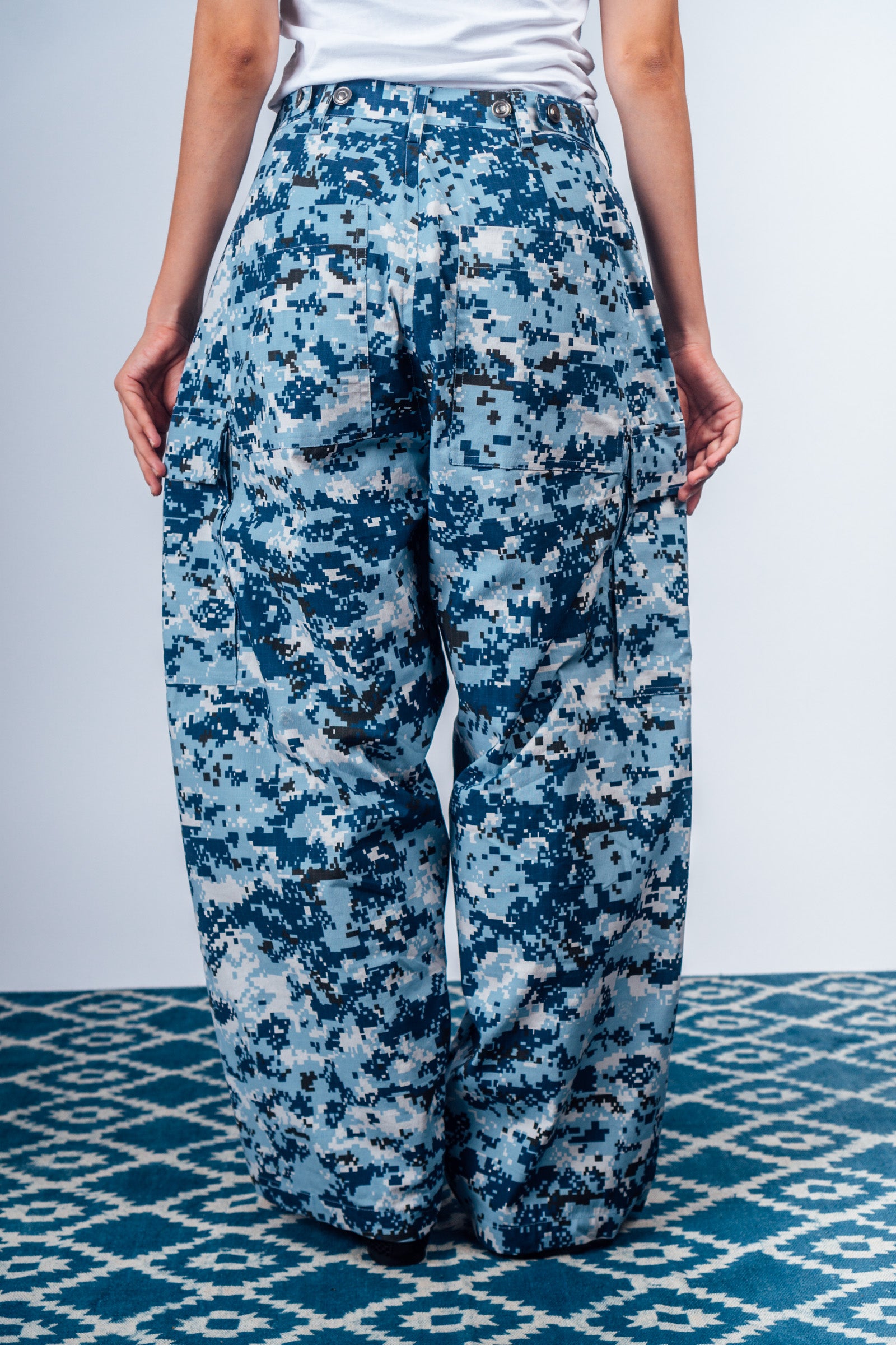 Inspired by vintage French Military M-47 Pants, these straight fit Cargo Pants are designed with comfort and reliability in mind. Made with a YKK zip, roomy side pockets and cargo pockets for enhanced storage. Double stitching ensures durability front pleats allow for easy movement. In addition to belt loops it also has side buttons that allow waist adjustment; this means that you can size up to get a baggy fit and still fit your waist. Cut from a deadstock ripstop Digital Camo printed fabric which offers effective concealment in maritime environments.