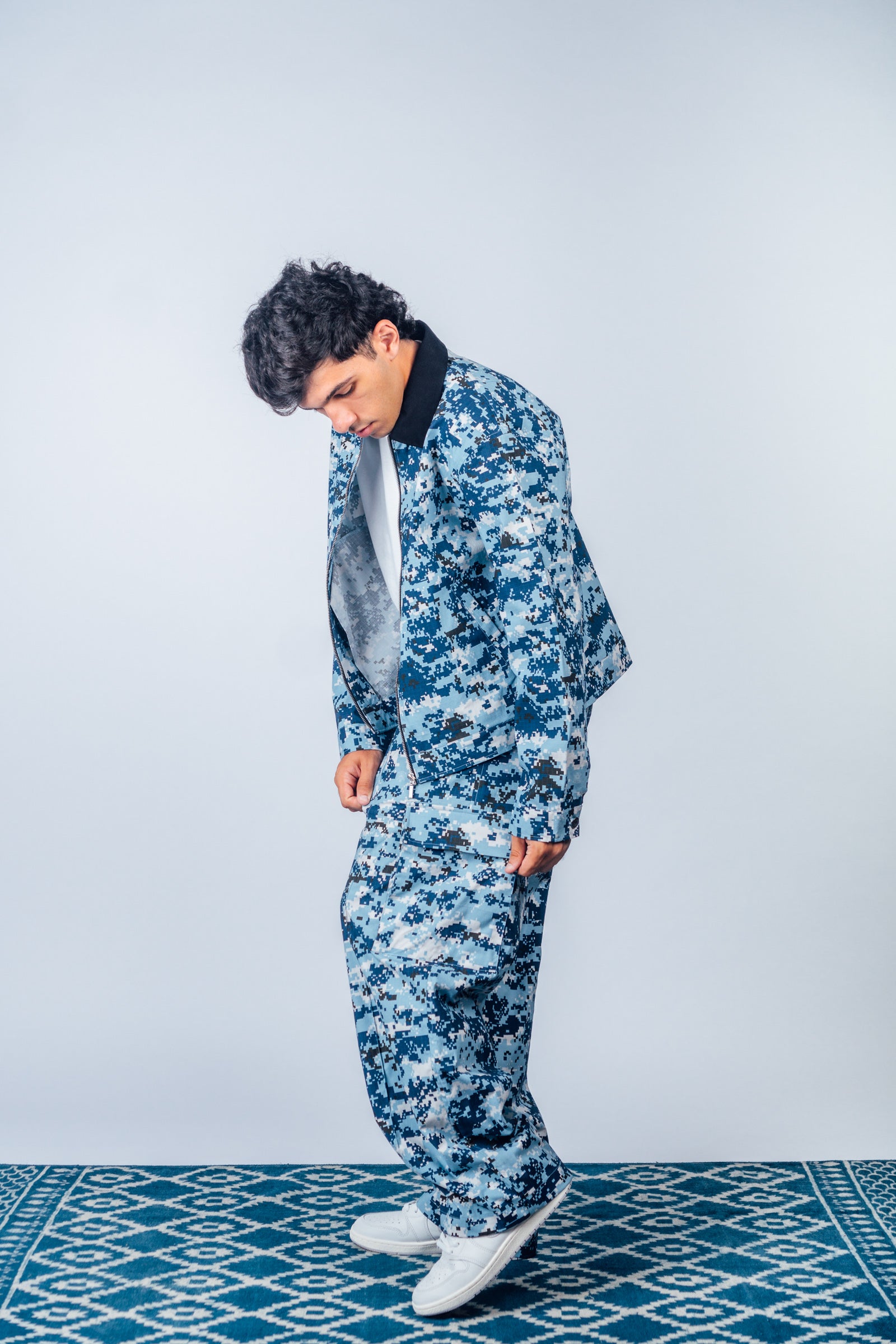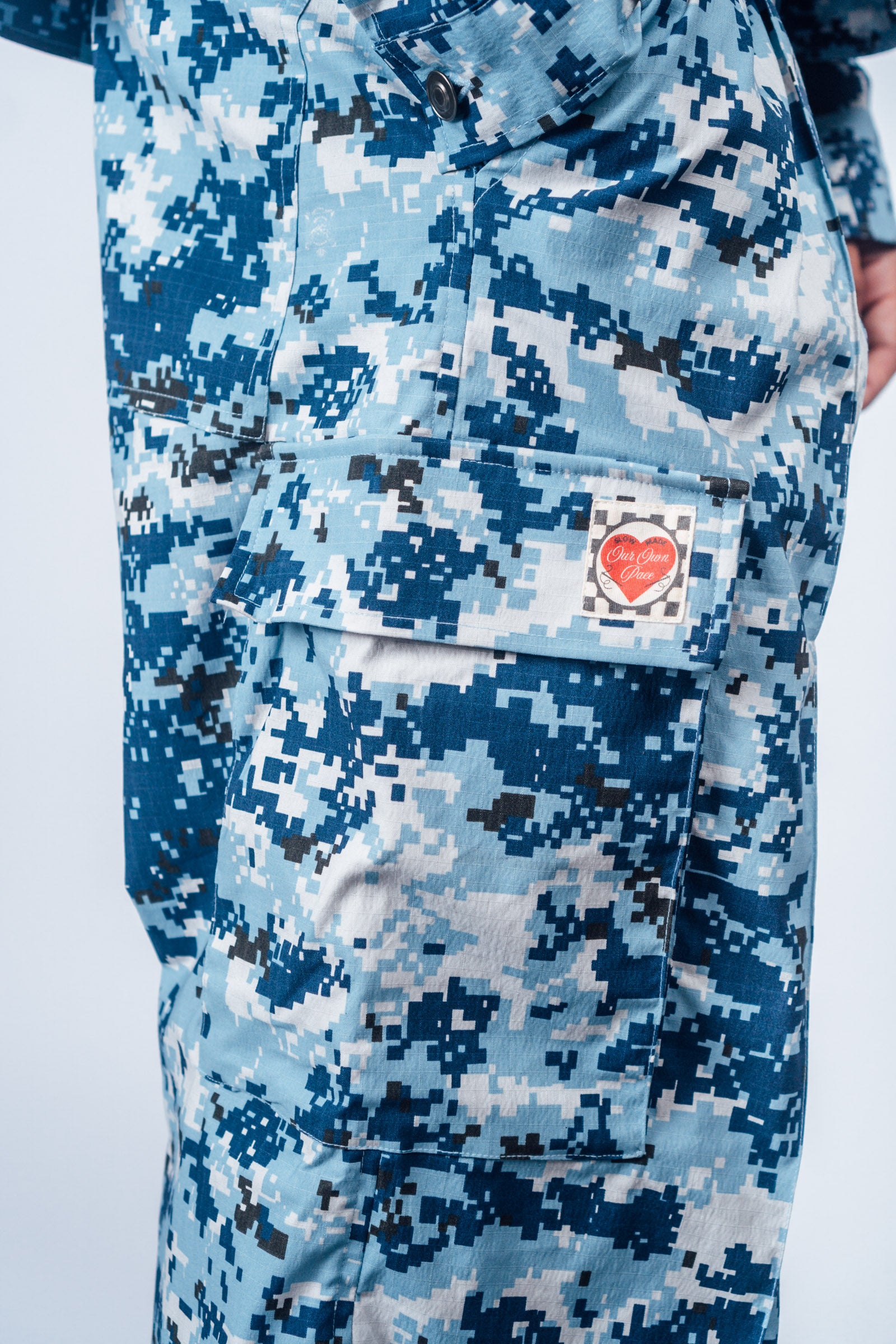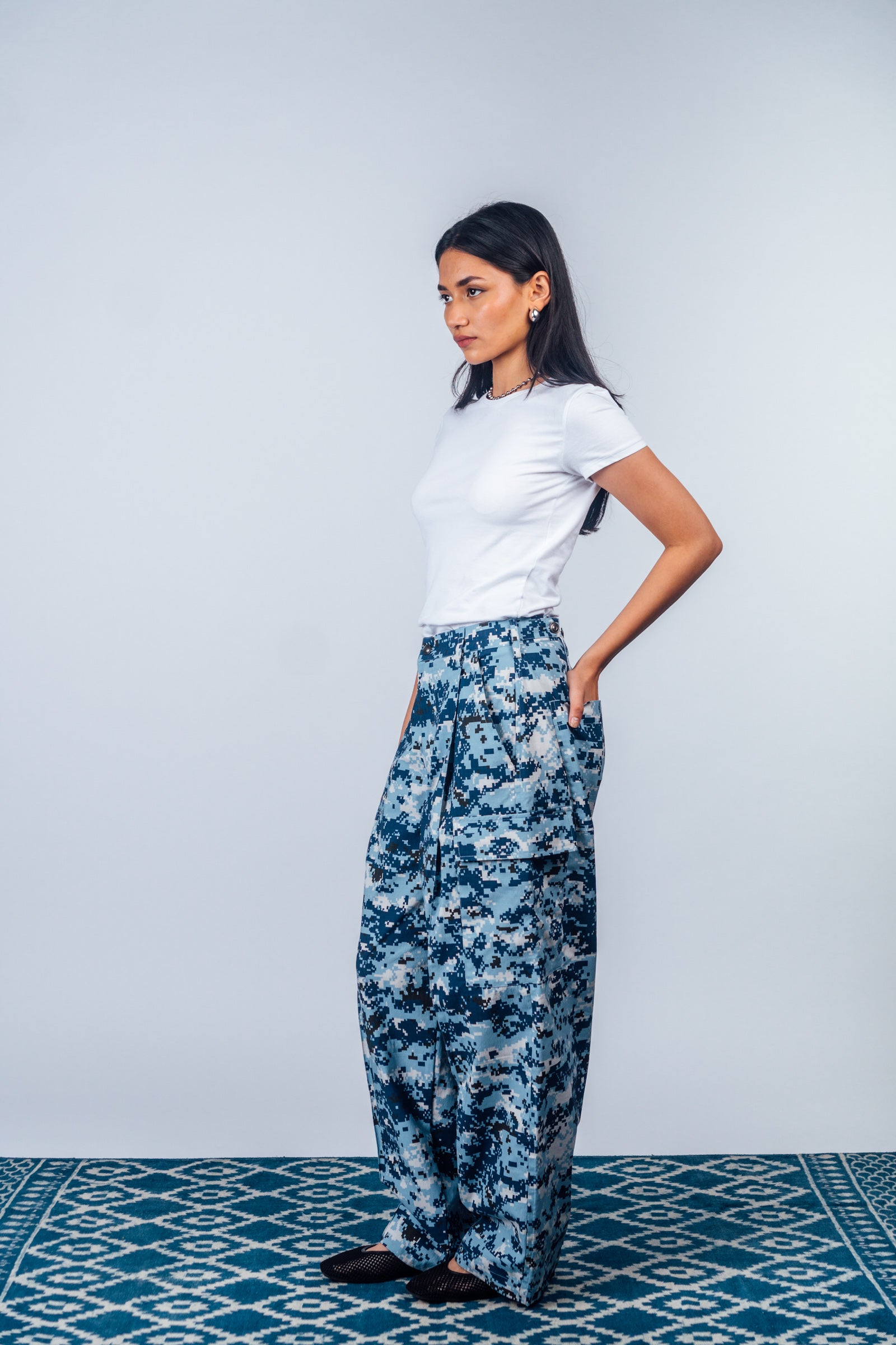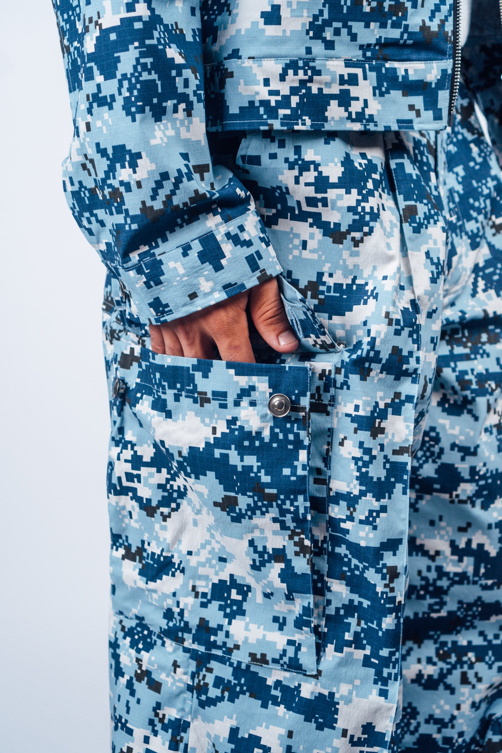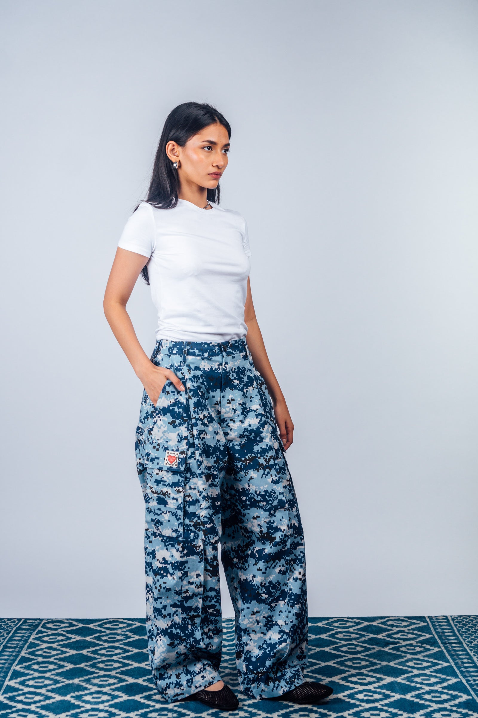 Inspired by vintage French Military M-47 Pants, these straight fit Cargo Pants are designed with comfort and reliability in mind. Made with a YKK zip, roomy side pockets and cargo pockets for enhanced storage. Double stitching ensures durability front pleats allow for easy movement. In addition to belt loops it also has side buttons that allow waist adjustment; this means that you can size up to get a baggy fit and still fit your waist. Cut from a deadstock ripstop Digital Camo printed fabric which offers effective concealment in maritime environments.