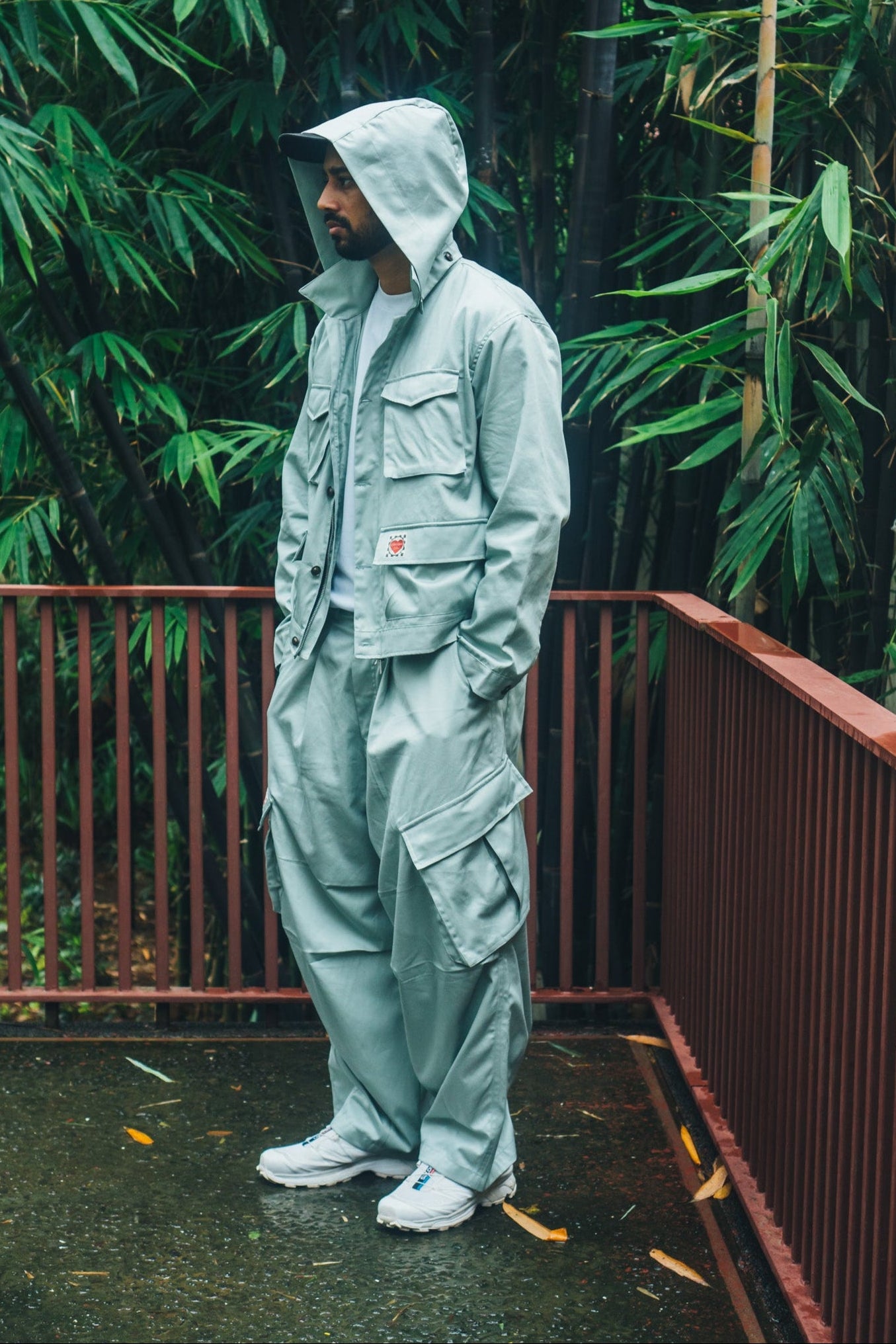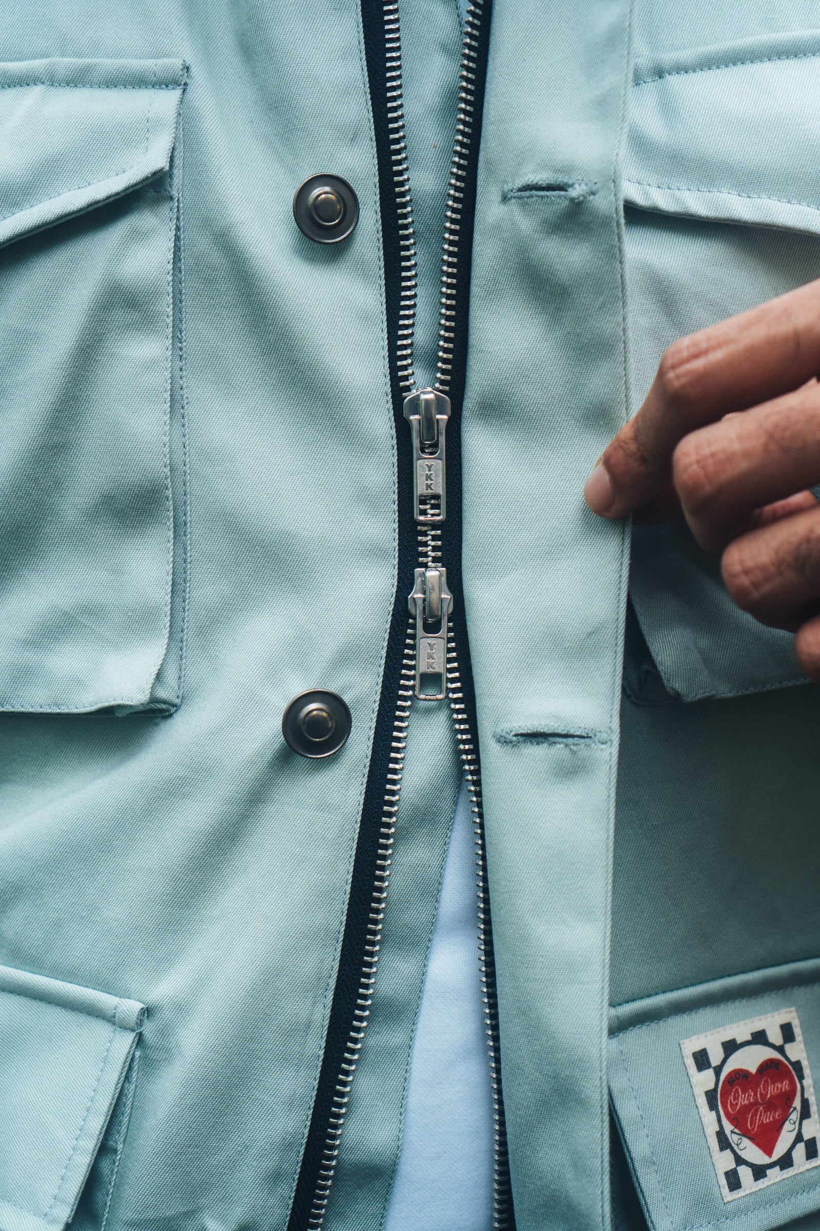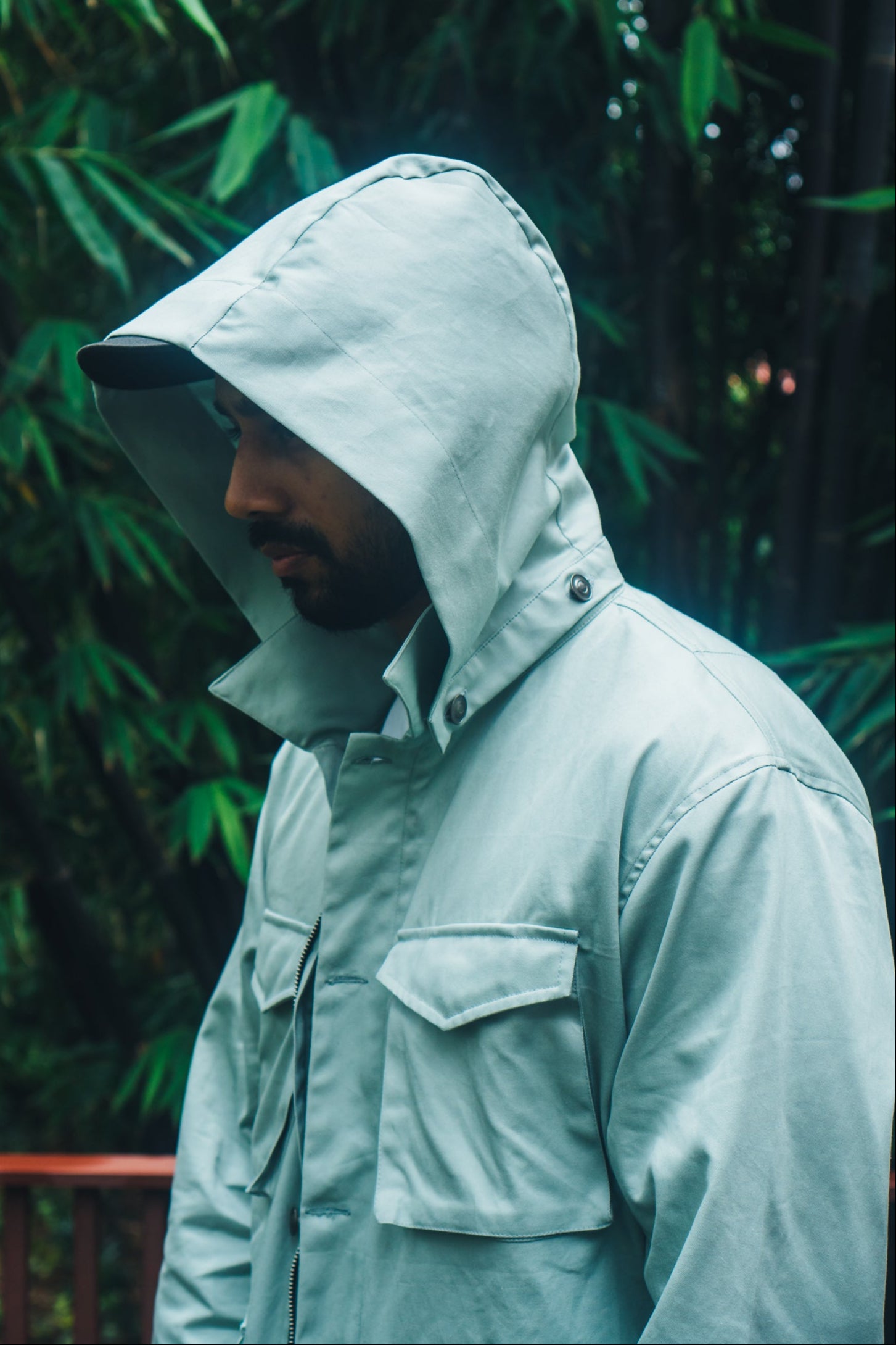 The M50x Field Jacket Jacket is our tribute to 50’s vintage military jackets. It is unlined with a boxy fit and drop shoulders. Cut from a deadstock cotton twill fabric with a water resistant coating which is sturdy and great for rainy days. Made with a buttoned rain flap, two-way YKK zip, two slanted top front pockets, two large front bottom pockets and internal pockets for the ultimate storage capacity. It also comes with a detachable hood made from the same material which allows you to leave your umbrella at home. Double stitching ensures durability while the relaxed armholes allow for easy layering.